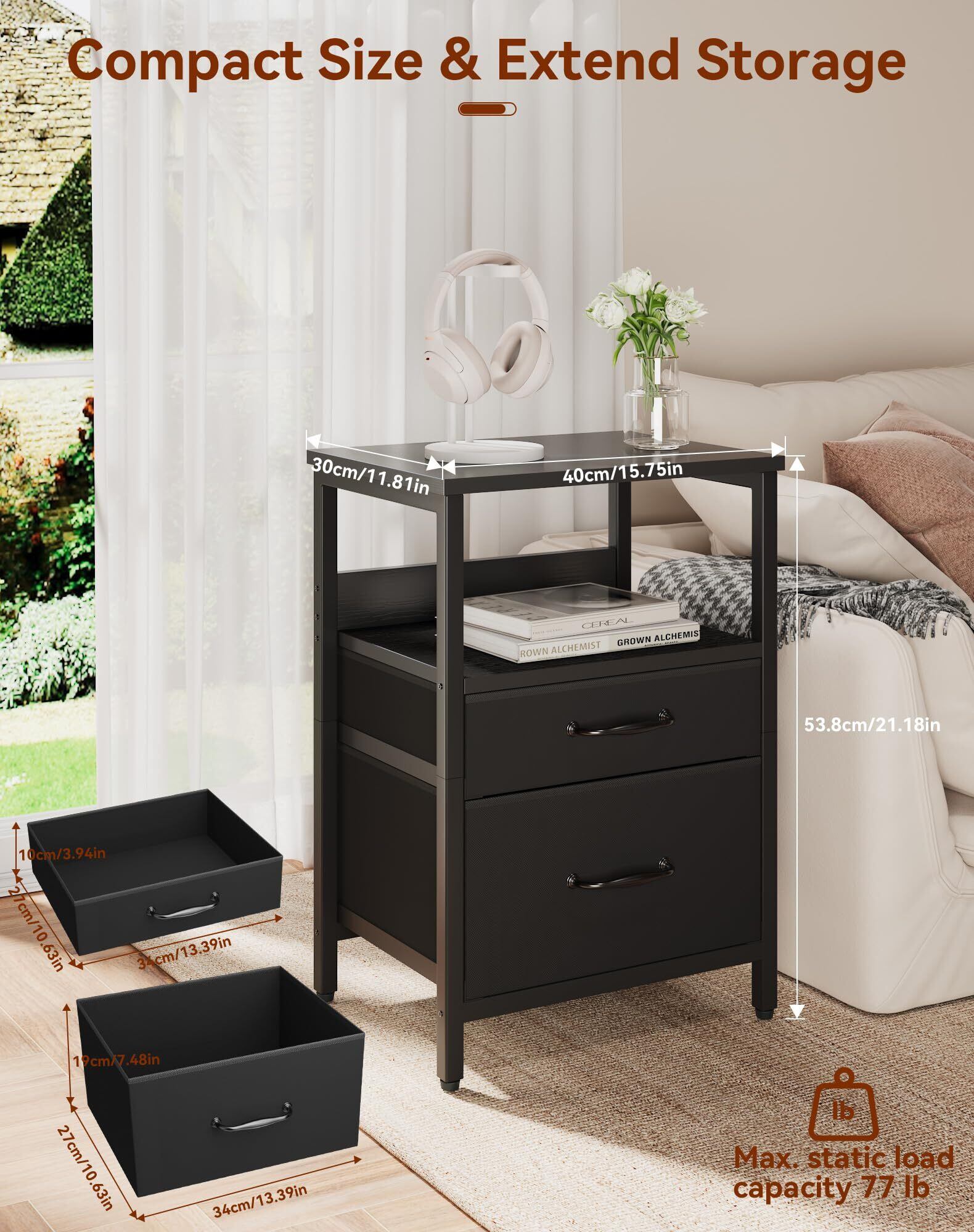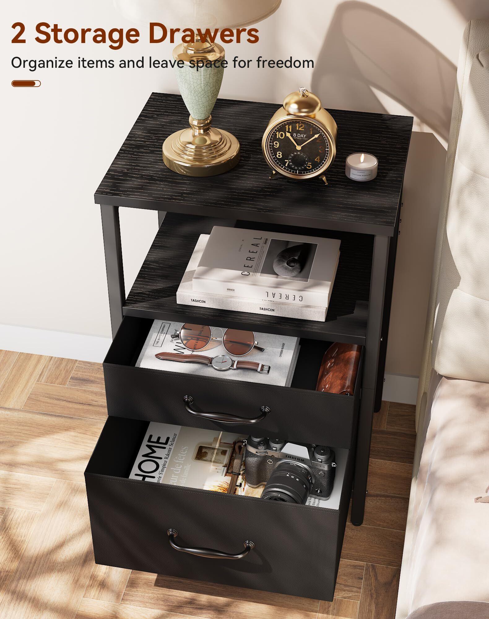 YMYNY サイドテーブル ナイトテーブル ファブリック引き出し付き 木目 アイアン&木製 組み立て簡単 コンパクト ナイトスタンド ベッドサイドテーブル ベッド横 ソファー横 ブラック HST011B