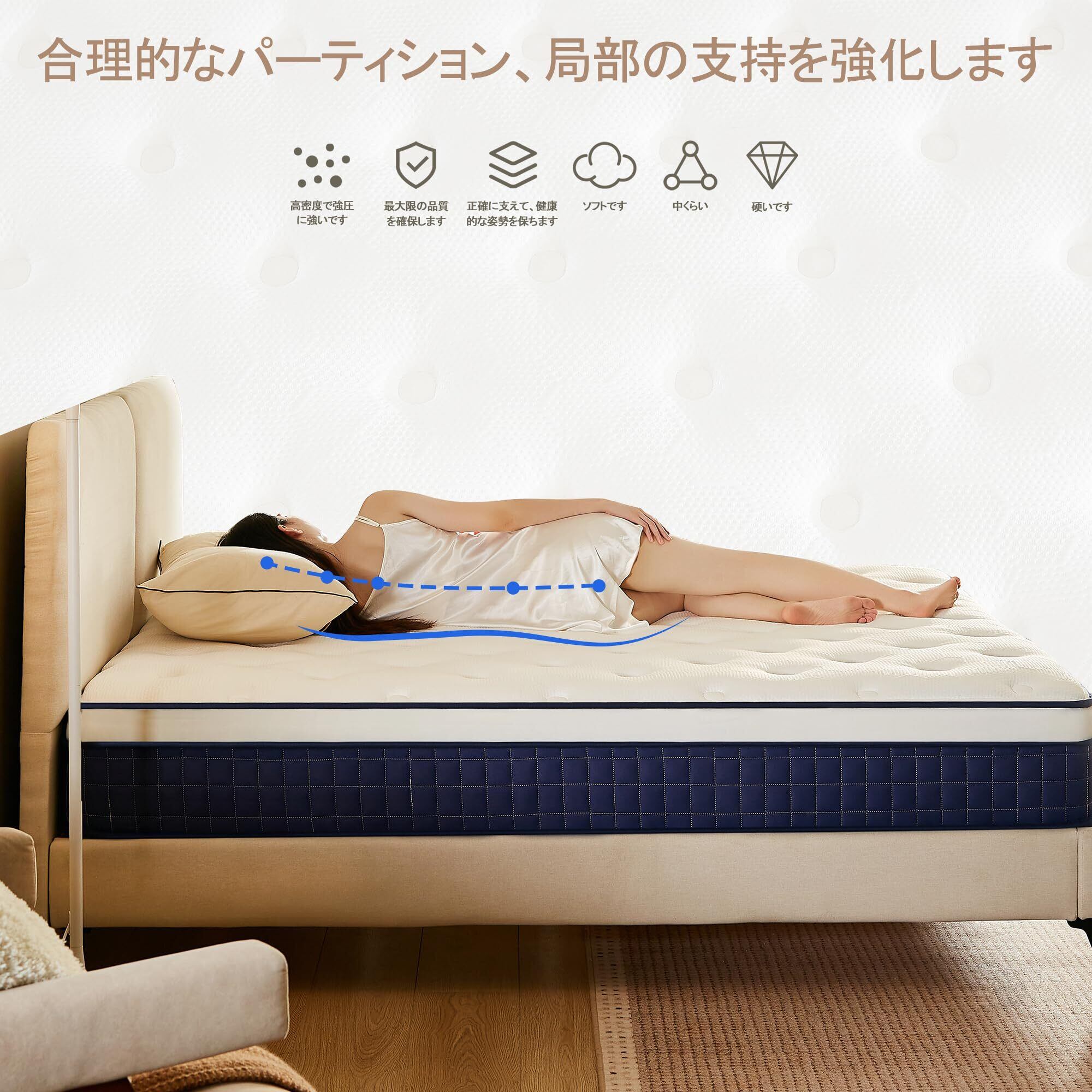 使い心地の良さをお届けします:開封後、わずか数時間でほぼ完成形! 特別な作業は不要。その日の夜から快適な睡眠をお楽しみいただけます。開封時の気になる匂いを大幅低減! 素材と製造工程にこだわり、できる限りクリーンな状態でお届けします。敏感な方にも配慮。畳やフローリングに直接敷ける! 省スペース設計の理想的なソリューション。賃貸住宅や子供部屋、ゲストルームにも最適