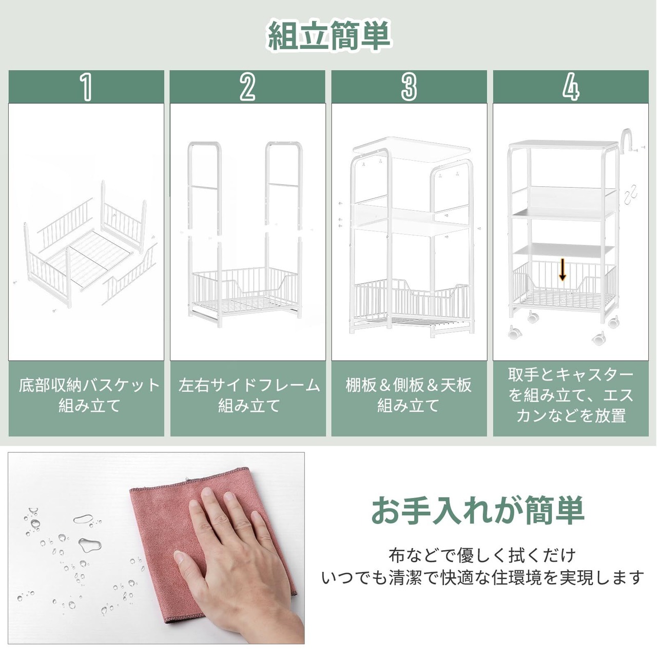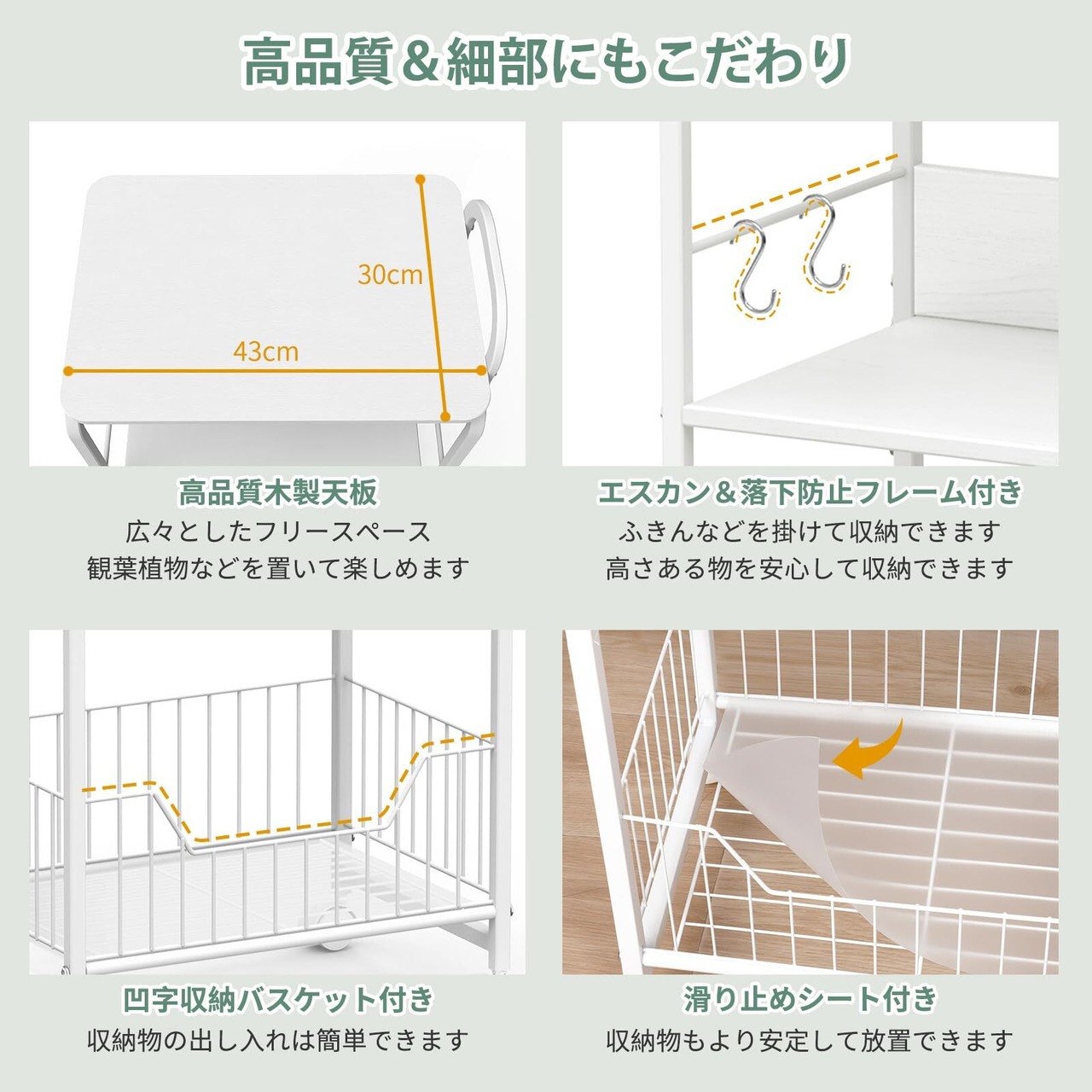 【高品質&細部にもこだわり】高品質且つ防錆メタルラックですので、耐久性が高く、長く使用することも可能です。また、吊り下げ収納できるエスカン(2個)と落下防止フレーム付き、ふきんやミトンを掛けて収納でき、ボトルなど高さある物も安心して収納できます。底部収納バスケットは凹字の形と設計して、収納物の出し入れも簡単できます。更に滑り止めシートも付き、収納物はより安定して放置可能のキャスター付きキッチンワゴンです。
