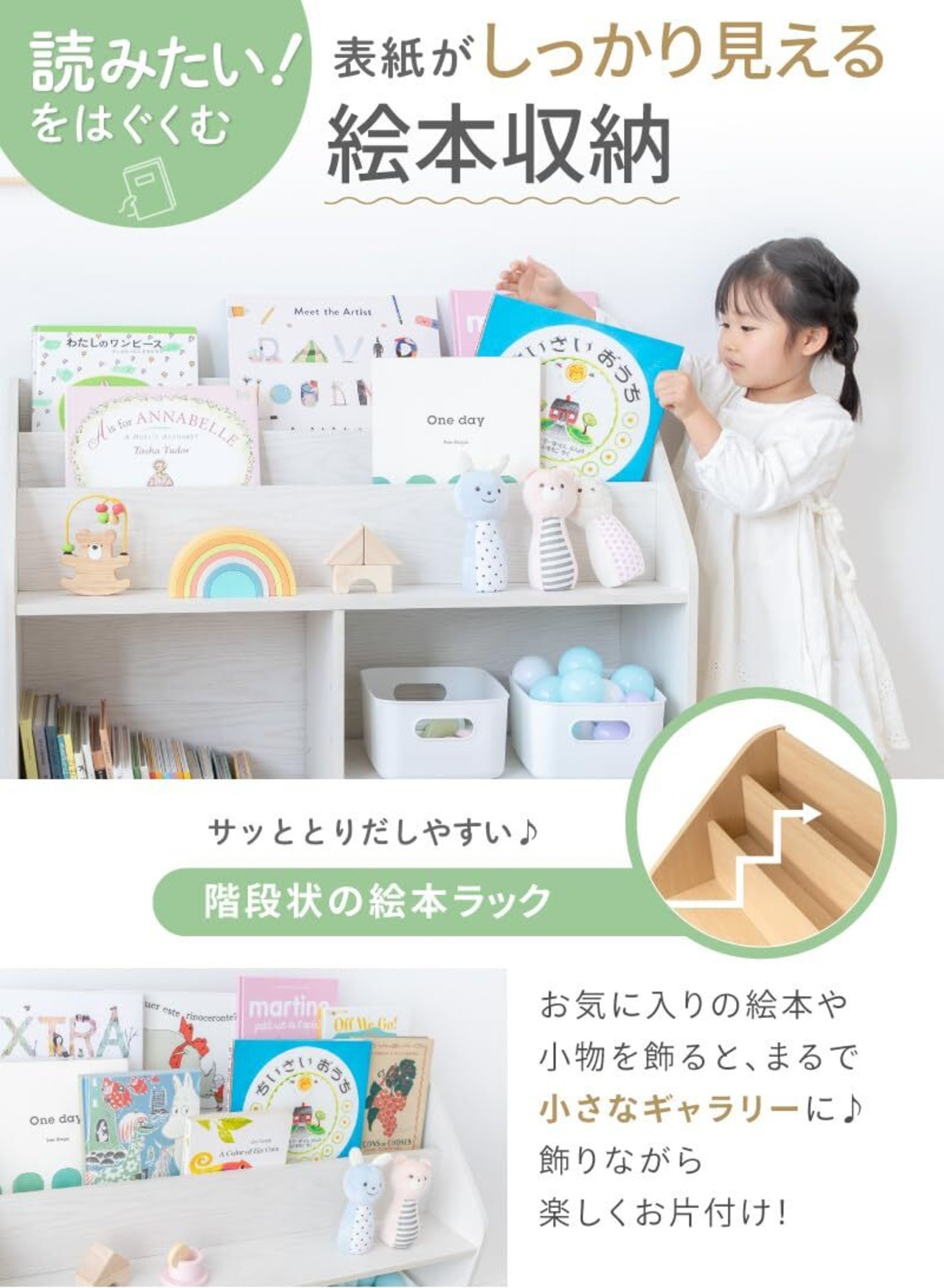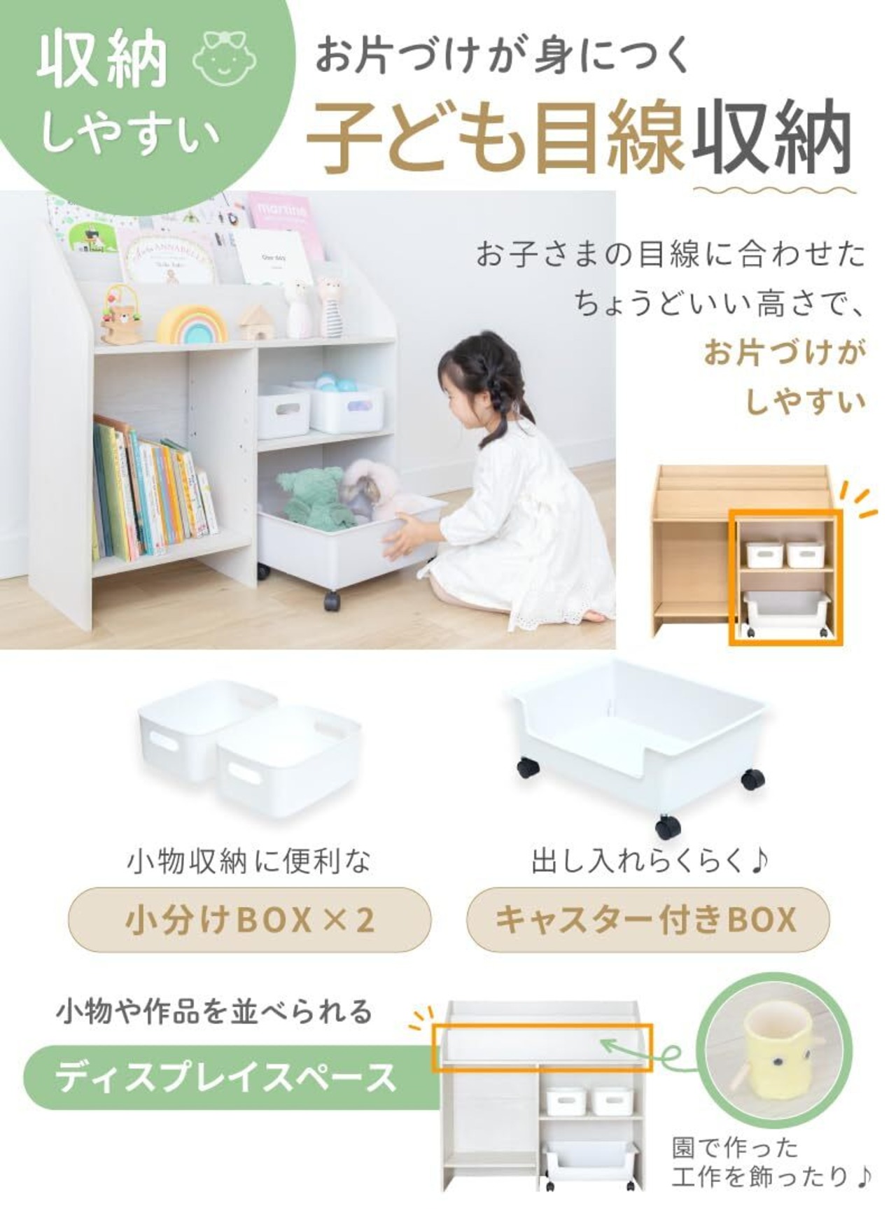 【見える収納と飾る楽しさ】 お子さまの目線に合わせたちょうどいい高さで、お片づけがしやすい設計にこだわりました。収納ボックスを使えば散らかりやすい小さなおもちゃも簡単にお片づけ。 絵本ラックは表紙がしっかり見えてさっと取り出せるよう階段状に。 ケラッタは最前面がディスプレイスペースになっているから家族の思い出や大切な工作を飾ることができます。 お気に入りの絵本や小物を飾ると、まるで小さなギャラリーに。 飾る楽しさでお片づけ習慣を自然とはぐくみます。