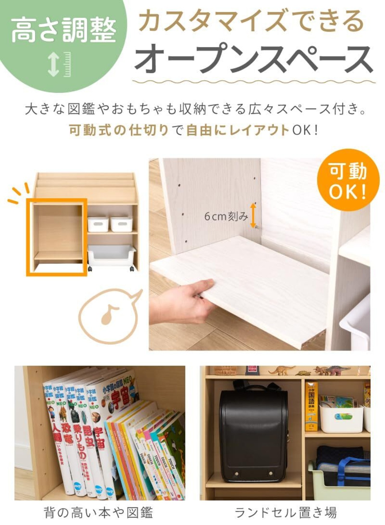 【成長に合わせて長く使える】 左下段は可動式の仕切りなので収納するものに合わせて自由にレイアウト可能。 シンプルなデザインで使いやすく、ランドセルもすっぽり入るサイズだからお子さまの成長とともに収納するものが変わっても調整しながら長く使えます。