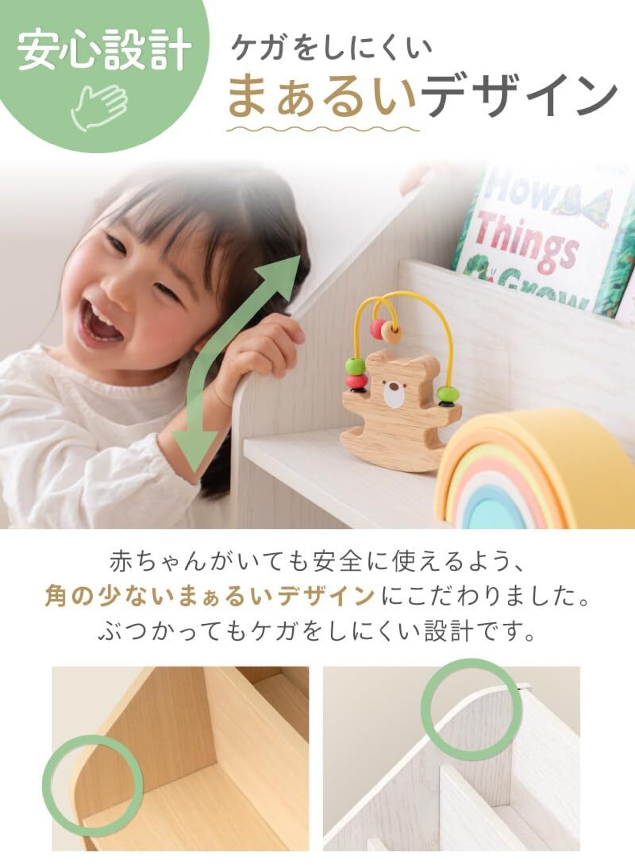 【お子さま想いの安心設計】 安全に使えるよう、角の少ないまぁるいデザインでぶつかってもケガをしにくい設計。 フローリングの傷を防ぐフェルトとネジ穴シールも付属しています。