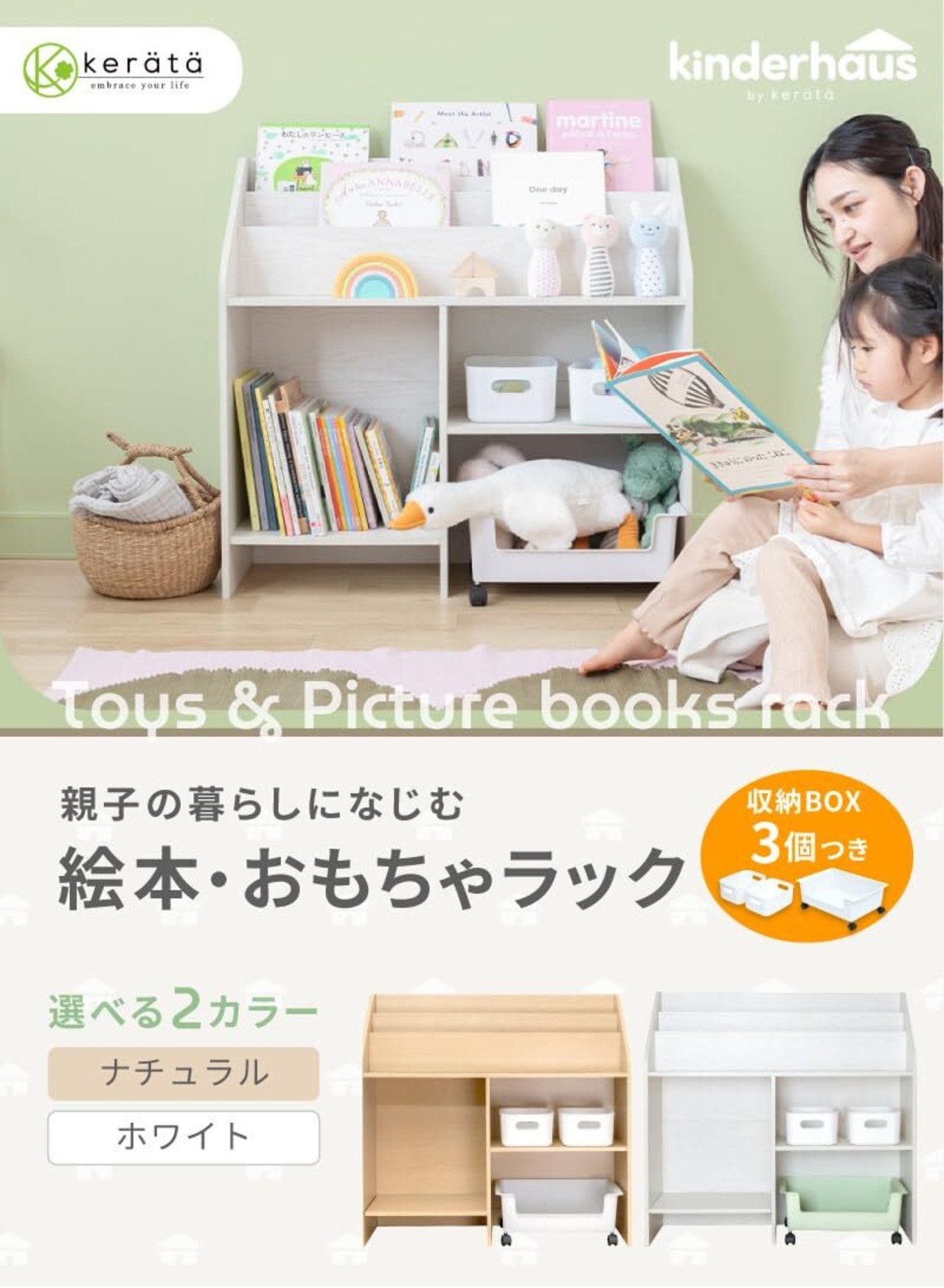 ケラッタの”kinderhaus(キンダーハウス)”シリーズから木製家具が誕生。 子ども目線で考えた「見える収納」と「飾る楽しさ」で、自然とお片づけ習慣をはぐくむ絵本・おもちゃラックです。 組み立て簡単、お掃除もスムーズにできてママパパにとっても使いやすく、毎日の暮らしに寄り添います。