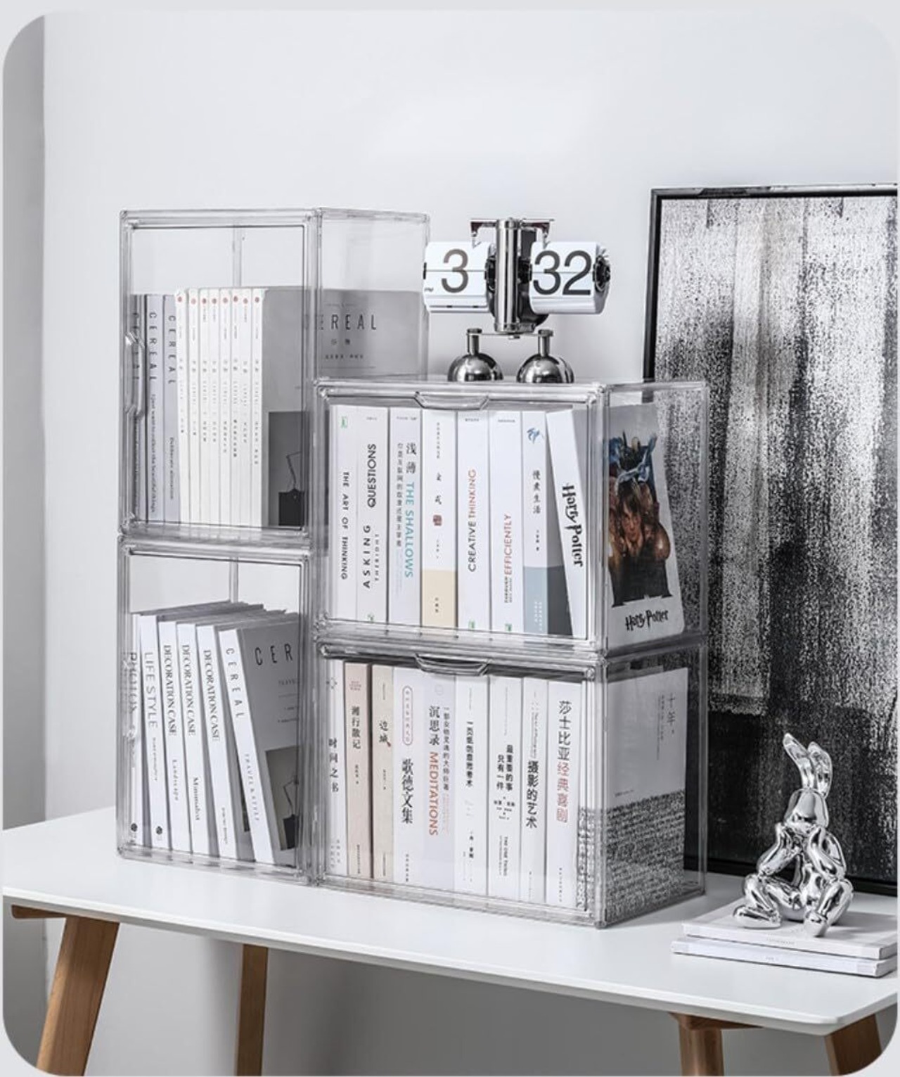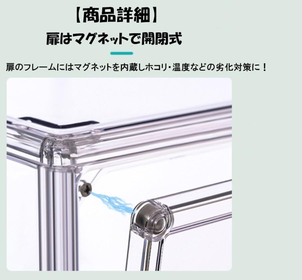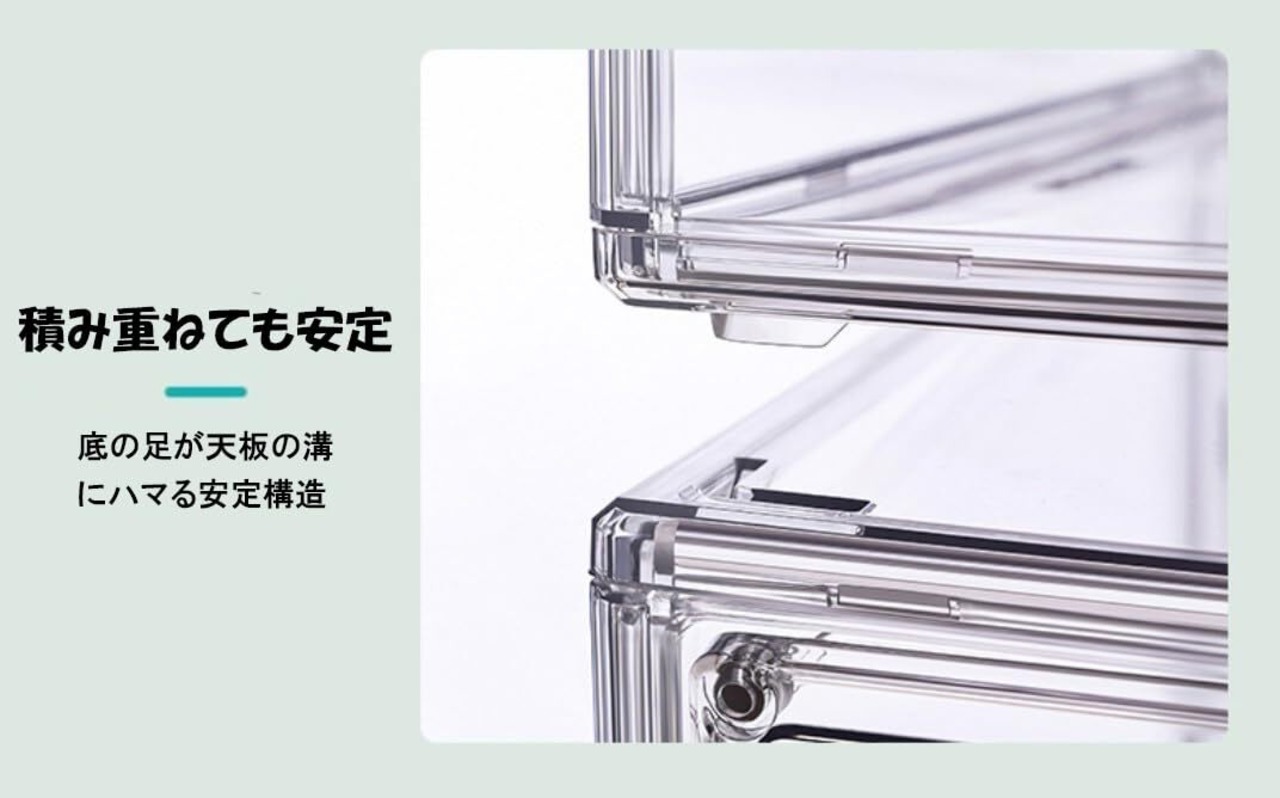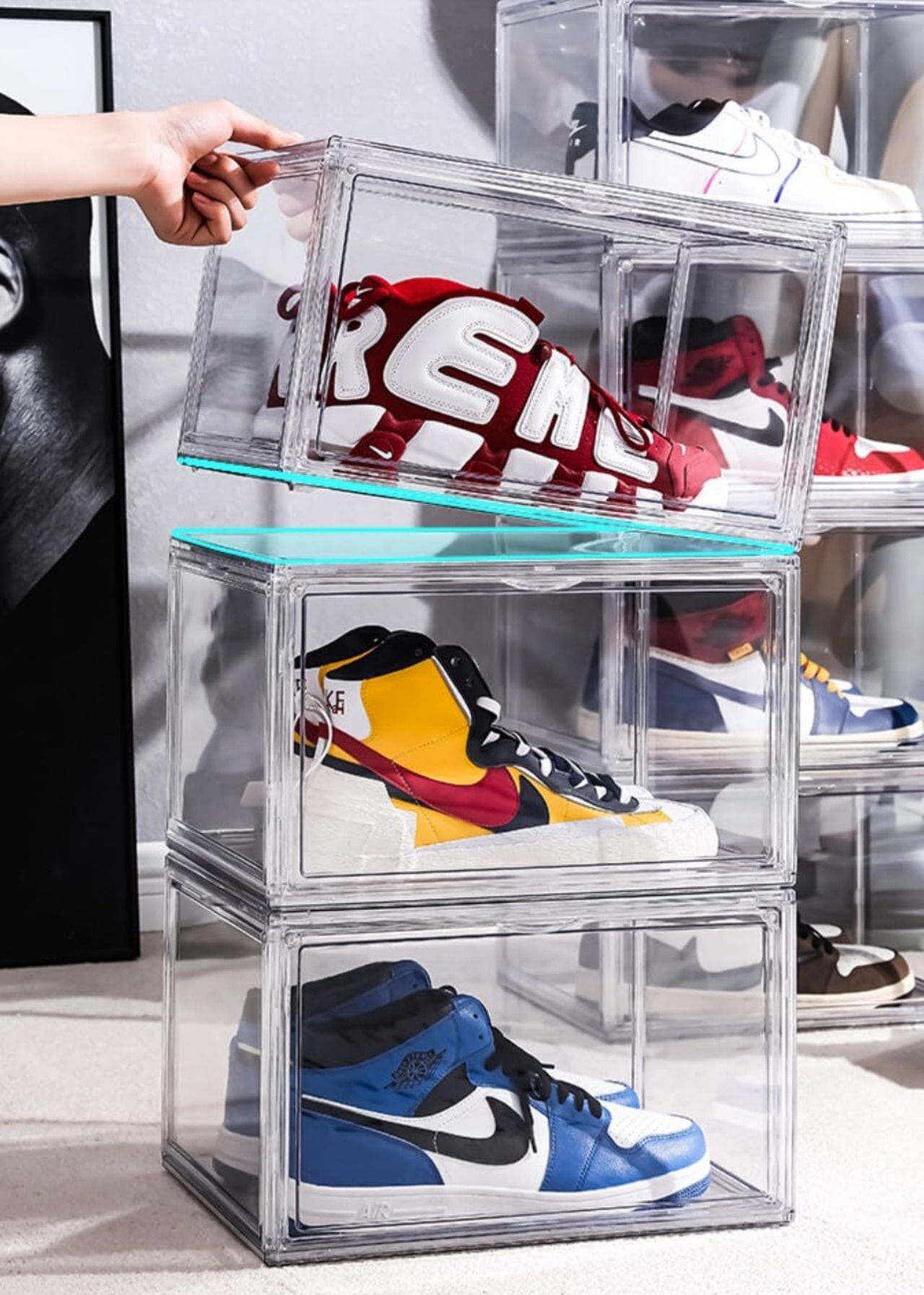 クリアで透明度が高い収納ボックスなので収納して飾ってもよし、 スタッキングが可能なので積み重ねてコレクションしても良し、 シューズを履きたい時は積み重ねた一番下段からも取り出しが可能な便利な2面の扉を開閉できます。