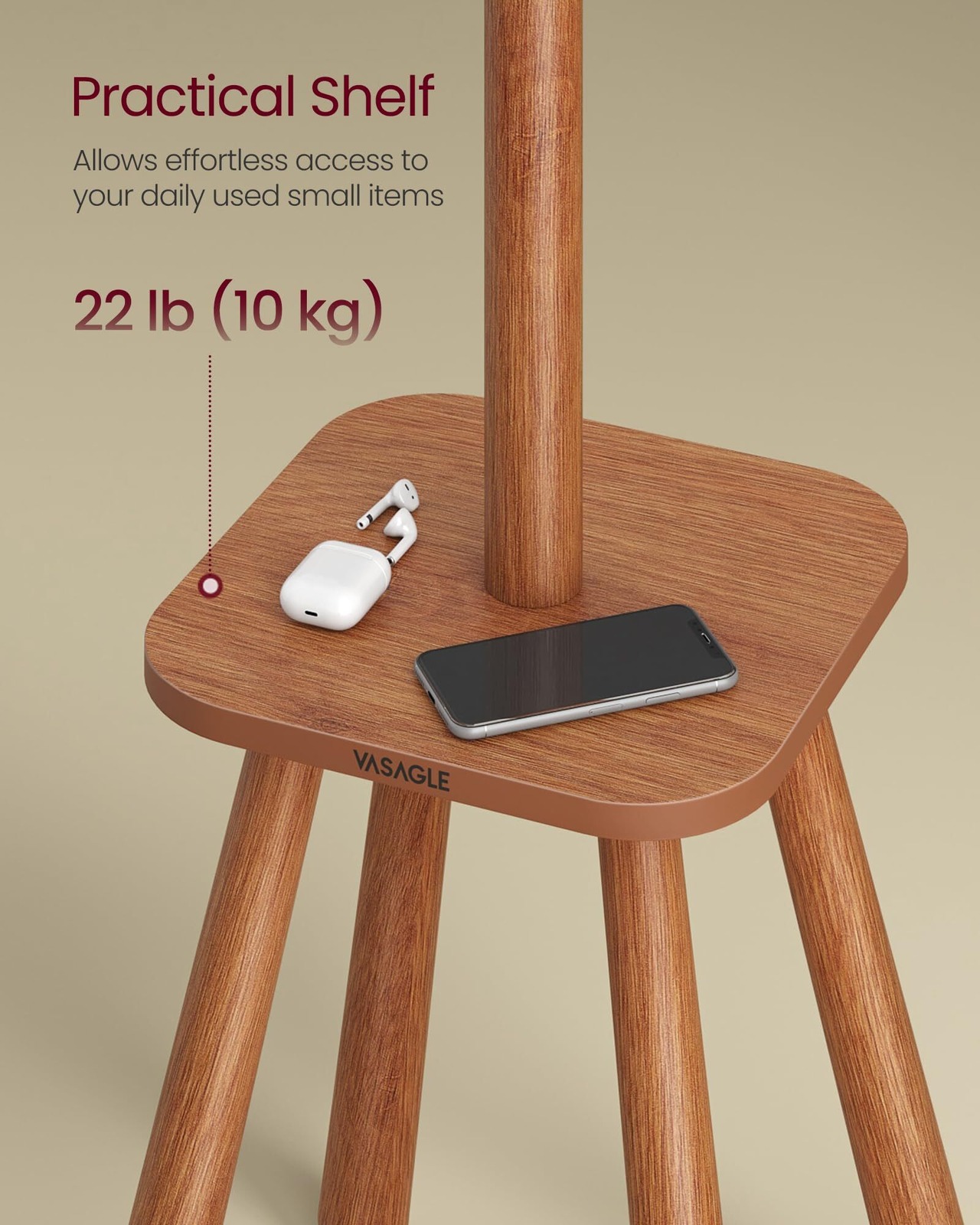 VASAGLE ポールハンガー コートハンガー フリースタンディングコートスタンド、8本のフックと収納棚付き、高さ170cm、コート・帽子・バッグ用、玄関・廊下・寝室用、ブラウン RCR033K01