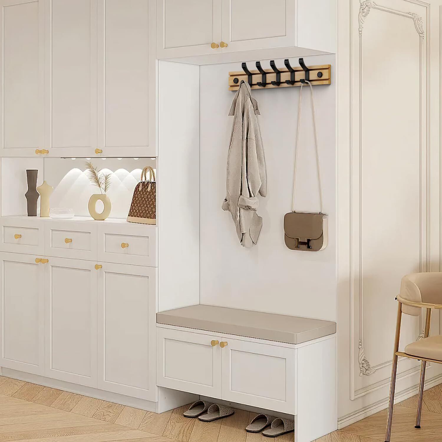 【壁面活用・省スペース収納】壁掛け式デザインでスペースを活用します。帽子、カバン、コート、傘、鍵、財布...などの服や小物を掛けられ、スッキリと一括収納します。玄関、リビング、寝室など様々な場所で便利にお使いいただけます。