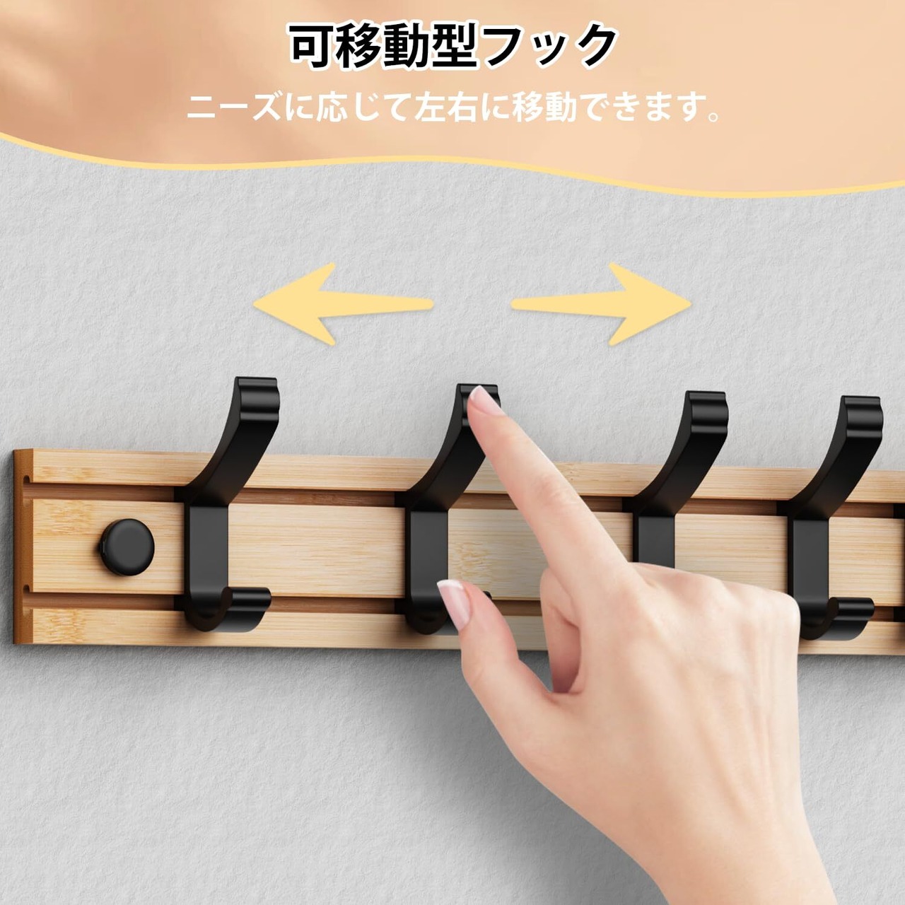 【可移動式フック】5連のフックは固定されておらず、左右に移動できます。そのため、フック間の距離は物のサイズに応じて柔軟に調整できます。ニーズに応じてフックの追加・取り外しもできます。
