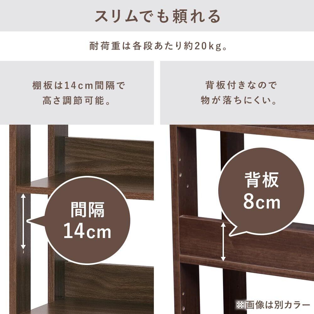 置く物に合わせて約14cm間隔で棚板の位置が調整可能です。