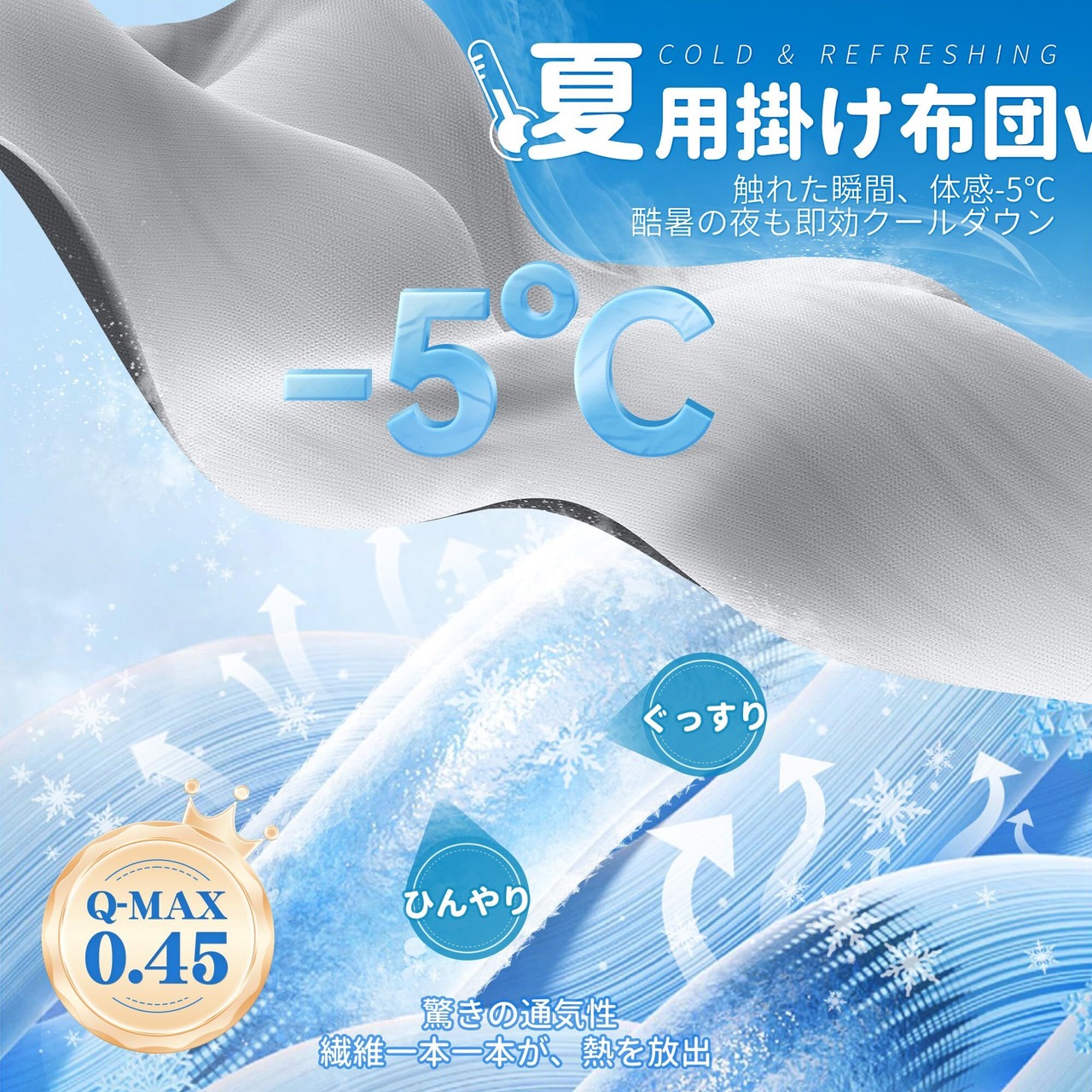 【まるで呼吸する繊維、朝までサラサラ快適】優れた吸湿性と通気性を持つこの冷感掛け布団は、寝ている間の汗や湿気を素早く吸収・放出し、外へ逃がします。ムレにくい構造だから、掛け布団の中は一晩中サラサラ。