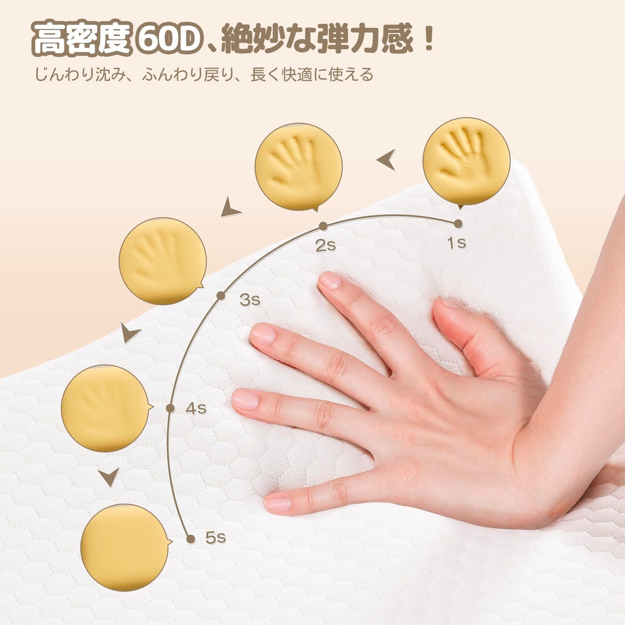 【高密度60D低反発ウレタン、ちょうど良いの枕】 中核に使用しているのは、反発しすぎず沈みすぎない密度60Dの高品質メモリーフォーム。頭がゆっくりと沈み込み、約5秒かけて自然に戻るスローバウンス構造が、就寝時の力みを解きほぐし、安心感あるフィット感をもたらします。しっかり支えて、やさしく包み、「柔らかさ×弾力」絶妙なのバランスを実現しました。高さは約6cmと10cmの2段階から選べるため、仰向け・横向きどちらでも自然な寝姿勢をキープ可能。