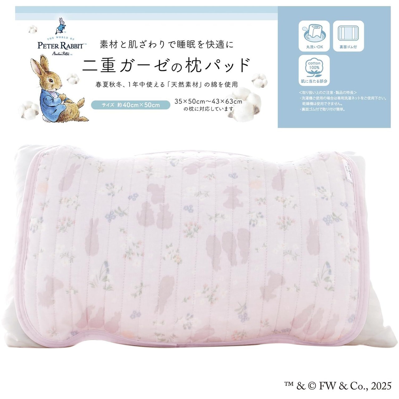 メリーナイト ピーターラビット(tm) 枕パッド 綿100% 「シャビーシック」 ライラックピンク 約40×50cm 二重ガーゼ ふんわり優しい肌触り 吸水性や通気性に優れている 裏面ゴム付き 就寝中のズレを防止 天然素材 洗える 衛生 清潔 オールシーズン快適な寝心地 淡い上品な色合いとシルエットのデザイン 幅広い年齢層に PRMP4032-16