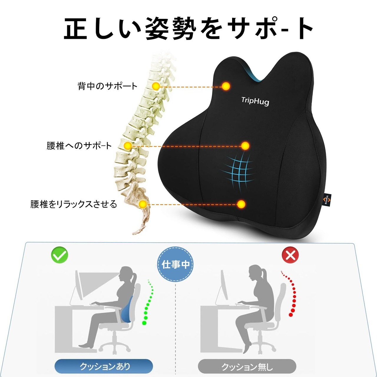 TripHug 低反発腰クッション 座椅子用バックサポートクッション オフィス用背中サポートクッション 快適で メモリーフォーム 長時間の座り仕事による腰への圧力を軽減 背中の負担を軽減 人間工学に基づいたデザイン 長時間運転、オフィスワーク、長時間座る方に最適
