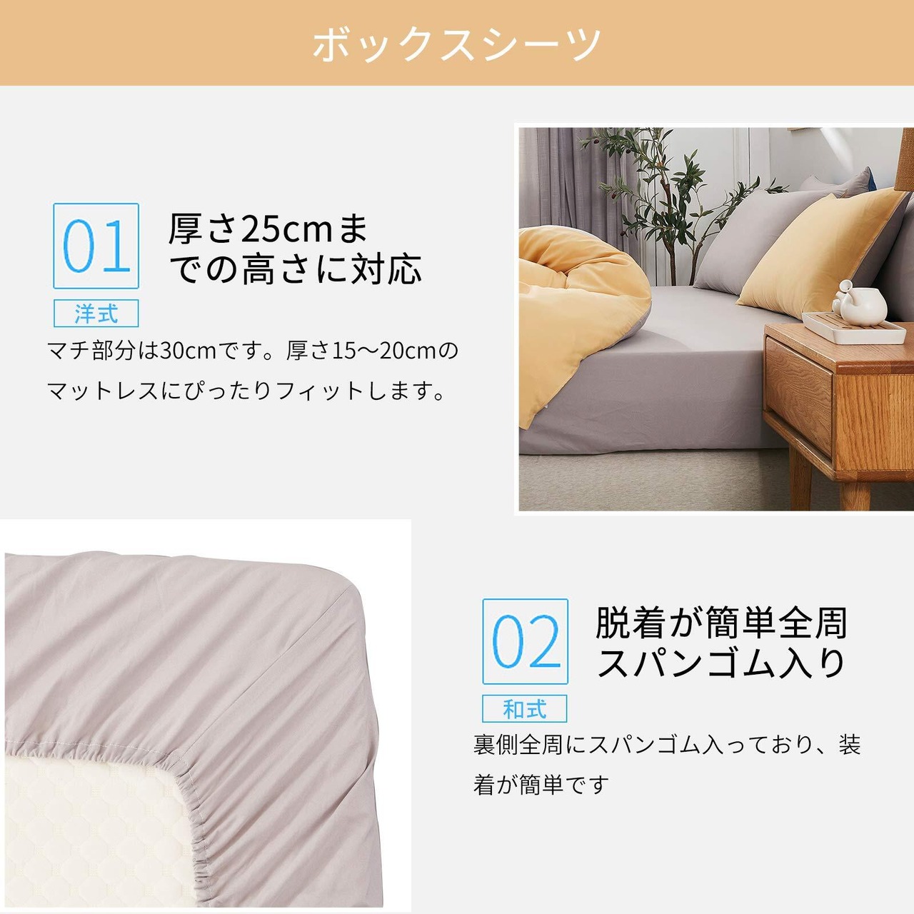 <セット内容と仕様>掛け布団カバー(1枚): 190X210cm, 布団留めひ付き。ボックスシーツ(1枚):140X200+30cm, サイズより大きめなので、高さ3-25cmの敷き布団とマットレスの底まで包む可能。枕カバー(2枚):43X63cm