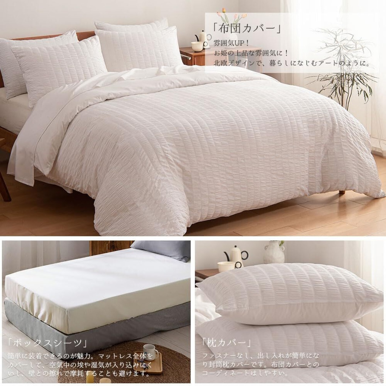 布団カバーセット シアサッカー生地 シングル ダブル 寝具カバーセット 3点セット 掛け布団カバー ボックスシーツ 枕カバー 可愛い 柔らかい 快適 通気性 速乾タイプ 丸洗い オールシーズ(シングル3点セット、ホワイト)