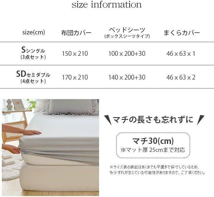 【サイズ展開】 【シングル3点セット】 布団カバー:150×210cm ボックスシーツ:100×200cm+30cm(マチ) 枕カバー:46×63cm×1枚 【セミダブル4点セット】 布団カバー:170×210cm ボックスシーツ:120×200cm+30cm(マチ) 枕カバー:46×63cm×2枚 お客様のご提案に感謝します。後ろの商品の枕カバーにはタグがありません。