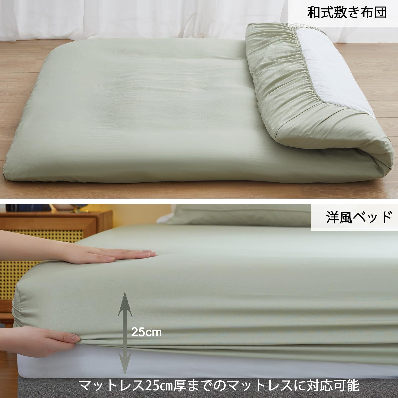 <セット内容と仕様>:布団カバー3点セットには、掛布団カバー(170×210㎝)1枚、枕カバー(43×63㎝)1枚、ボックスシーツ(120×200×30㎝)1枚が含まれています。掛布団カバーは170 ㎝の横辺にファスナー開口があります。6カ所紐付きで布団がずれないよう固定ができます。マットレスは25㎝厚まで対応可能。