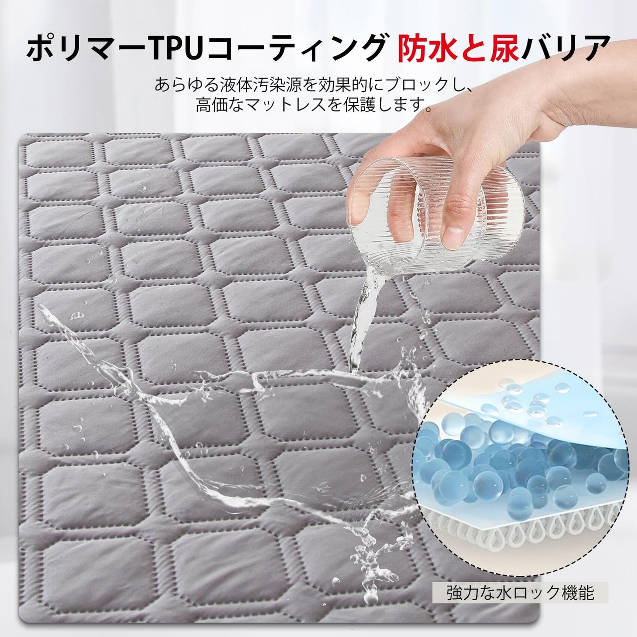 【圧倒的な防水性】:裏面には通気性の高いTPU防水膜を採用し、通常の防水膜よりも通気性が高く、粘りも強くなる。防水性を高めて、汗・水などをかけでも、マットレスに水分は到達しません,お子様のおねしょやペットのそそう、高齢者・病人などの介護用寝具を汚してしまう心配を軽減し、清潔・衛生的に保ち、心地よい眠りをサポート。