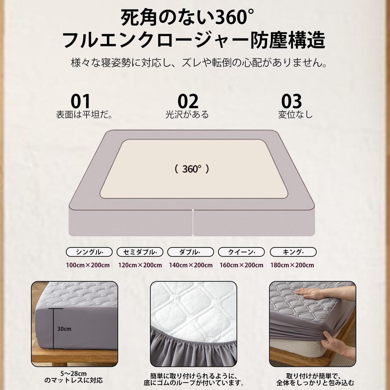 【商品情報】サイズ:クイーン・160X200*30cm 素材:表生地-ポリエステル100%、裏生地-TPU防水膜100%、詰め物-綿100% 仕様:全周ゴム付きで、シーツのマチが30cmあるので、厚さ5cm~28cmのマットレスに適しています。