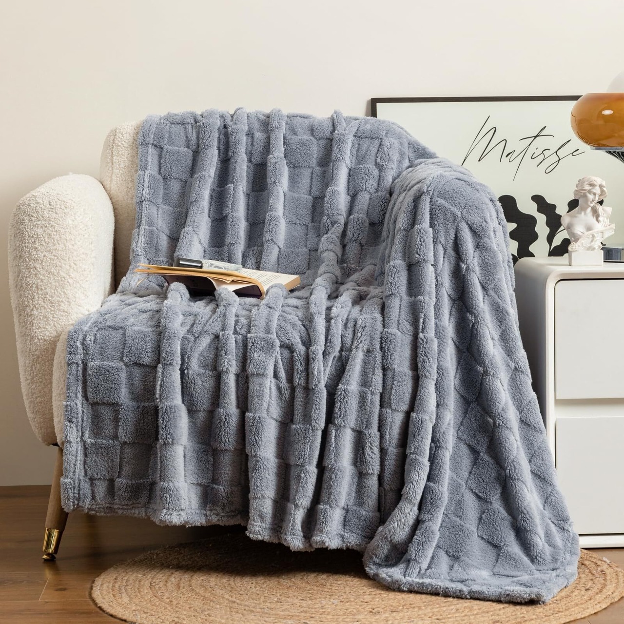 Mokoya 毛布 ダブル 180x200cm おしゃれ ブランケット チェック柄 もこもこ フリース 暖かい 掛け毛布 柔らかい 通年使用 Blanket (グレー)