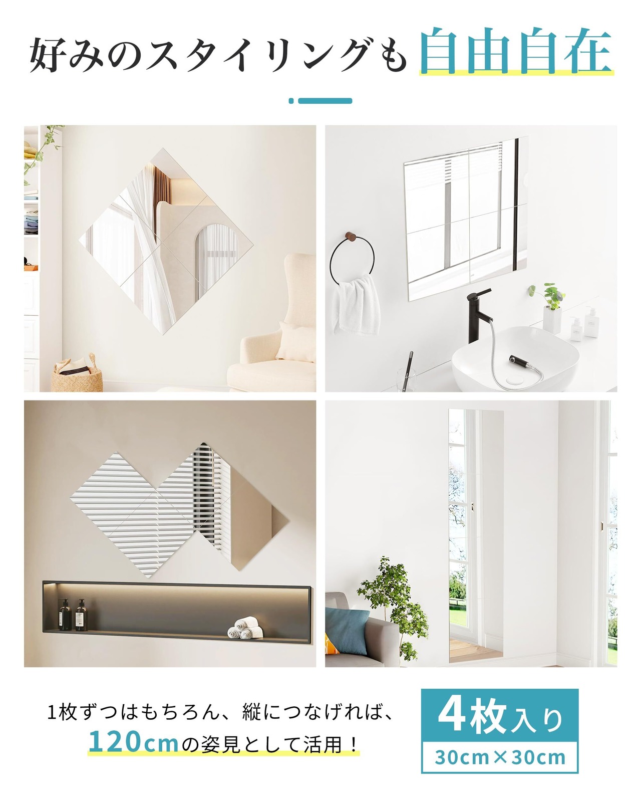 【割れない鏡】 アイクラシ(Ikurashi) 鏡 姿見 全身鏡 壁掛け 貼る鏡 【どこでも貼れる】30×30cm×4枚 壁掛け鏡 壁に貼る鏡 ミラー 超軽量 浴室 玄関 ドアの裏やクローゼット 子供部屋
