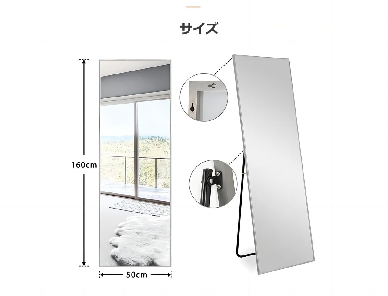 【160cmの大サイズで多用途に対応】大サイズ(160cm)の大きな鏡は、全身のコーディネート確認やポーズチェックが可能。ダンススタジオ、美容室、リビングなど幅広いシーンで活躍します。
