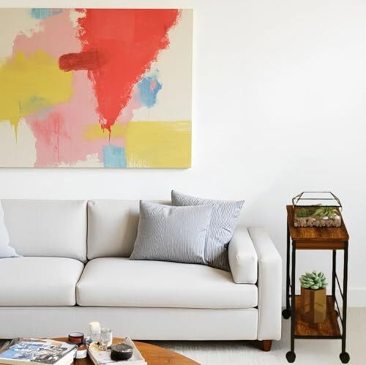 オープンストレージ:このサイドテーブルには、木製の棚2つと布製の引き出し1つが付いています。十分な収納スペースにより、雑誌、本、リモコン、その他の日用品を簡単に整理でき、すべてを手の届くところに置いておけます