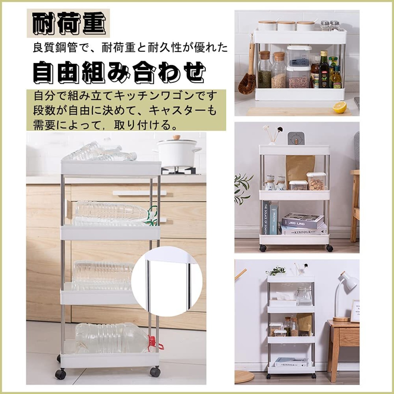 【360°可動・自由回転キャスター】 キャスター付きの収納ラックは便利で使いやすいと思います。キッチンワゴンには4キャスターが付いています。ワゴンを固定したい時は、その2キャスターをロックし、ワゴンが動かないようになりました。隙間にはゴミや埃がはいている場合、ワゴンをちょっと動かしスムーズに移動することができます。家事がラクラク!