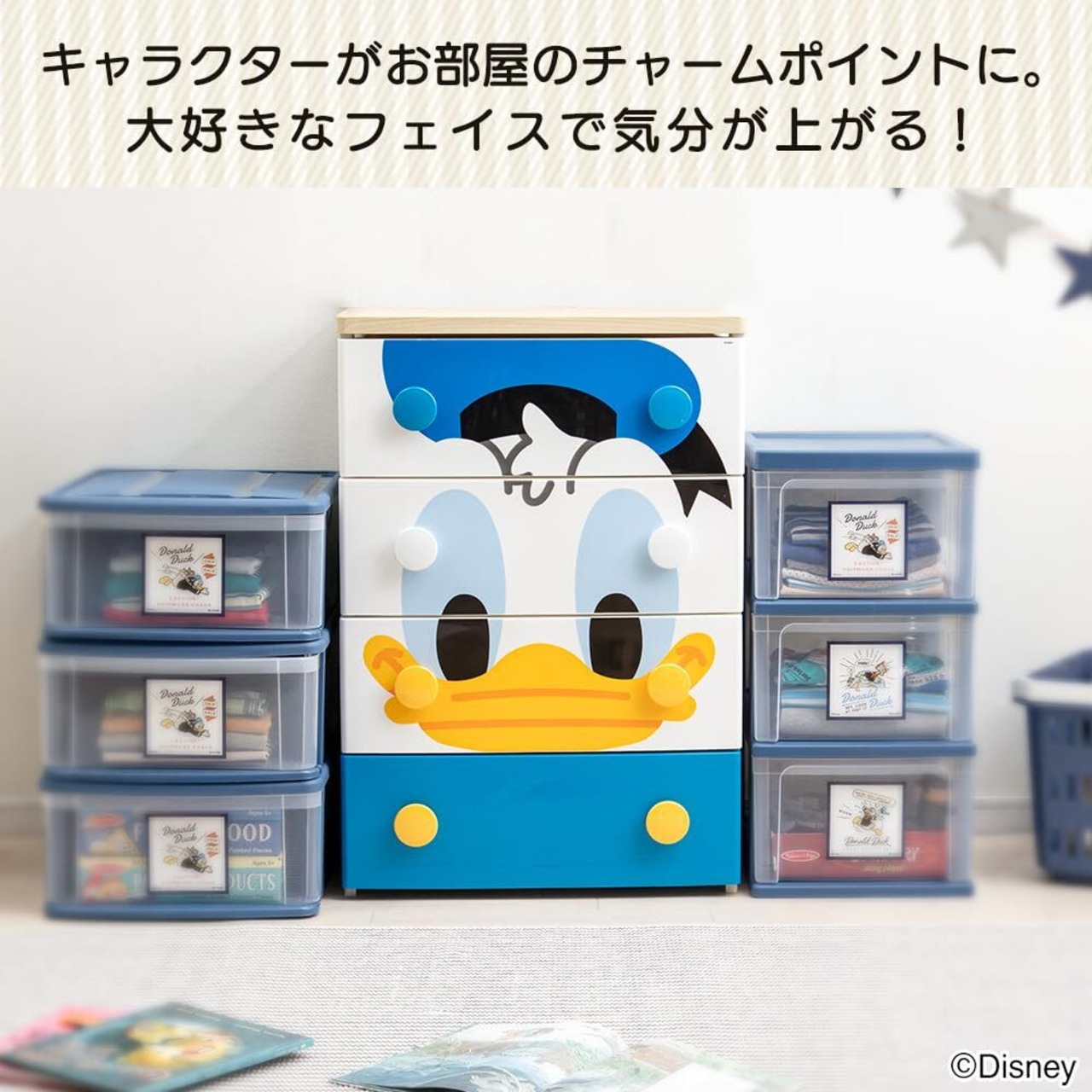 アイリスオーヤマ 収納 チェスト ディズニー ドナルド 4段 キッズ 木天板 完成品 日本製 幅56×奥行43×高さ81㎝ NHG-W554