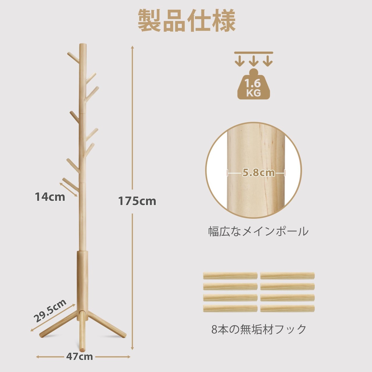 ポールハンガー 木製 衣類収納 コートハンガー 洋服ラック Azaeahom 40kg耐荷重 ハンガースタンド 枝型フック設計 高さ175cm 3段高さ調節可能 フック8個 組み立て簡単 ネジ式 倒れ防止 リビング 寝室 (木の色)