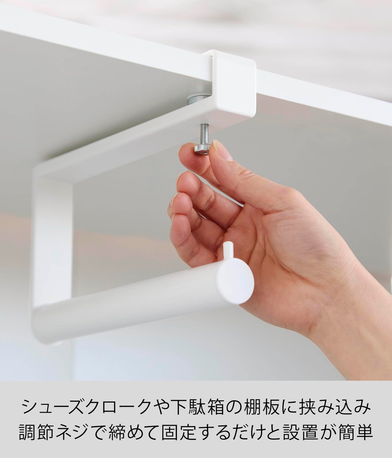 付属品:六角レンチ ▪耐荷重:3kg(静止荷重) ▪対応サイズ:収納数の目安 長傘5本 ※サイズや形状によっては設置・収納できない物もあります。 ▪取り付け可能な棚板:棚板の厚さ:1cm~2cm 扉と棚板との隙間:3mm以上 ※棚板の裏に溝がある場合、溝が棚板の手前から3cm以内のもの