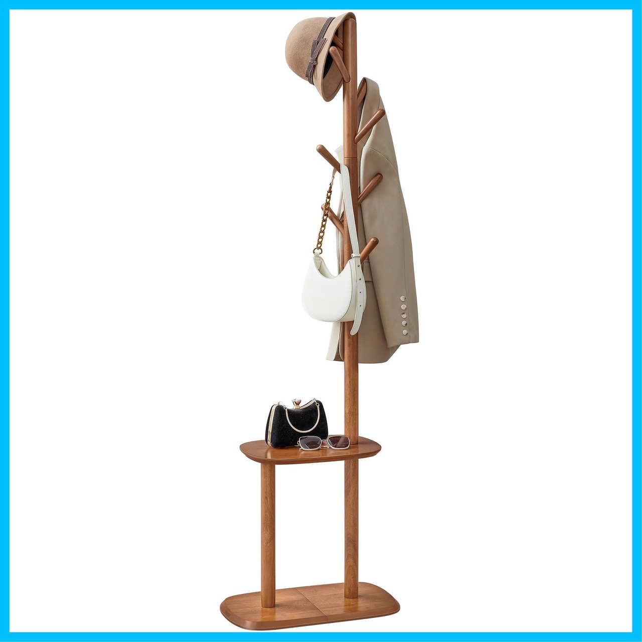 【堅固で広々とした収納スペース】このコートハンガーには丈夫なフックが8つ付いており、それぞれ4kgまでの重量を支えることができます。コート、帽子、バッグを掛けるのに最適です。中央の棚は追加の3つのスペースを提供し、鍵、本、財布などを収納して入口をきれいに整頓された状態に保ちます