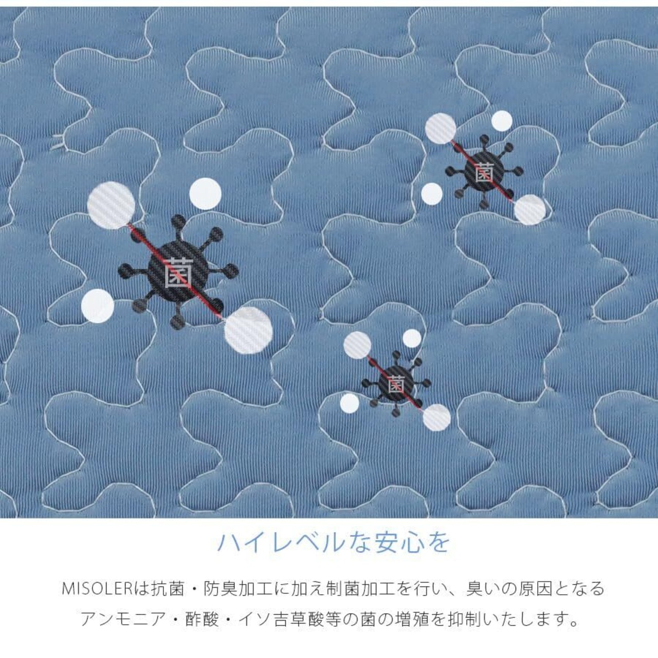【制菌防臭加工】:防臭の中棉を使用しています。菌の繁殖を抑え、イヤな臭いを防ぎ、いつも気持ちよくご使用できます。小さなお子様のいるご家庭でも安心して使えます。