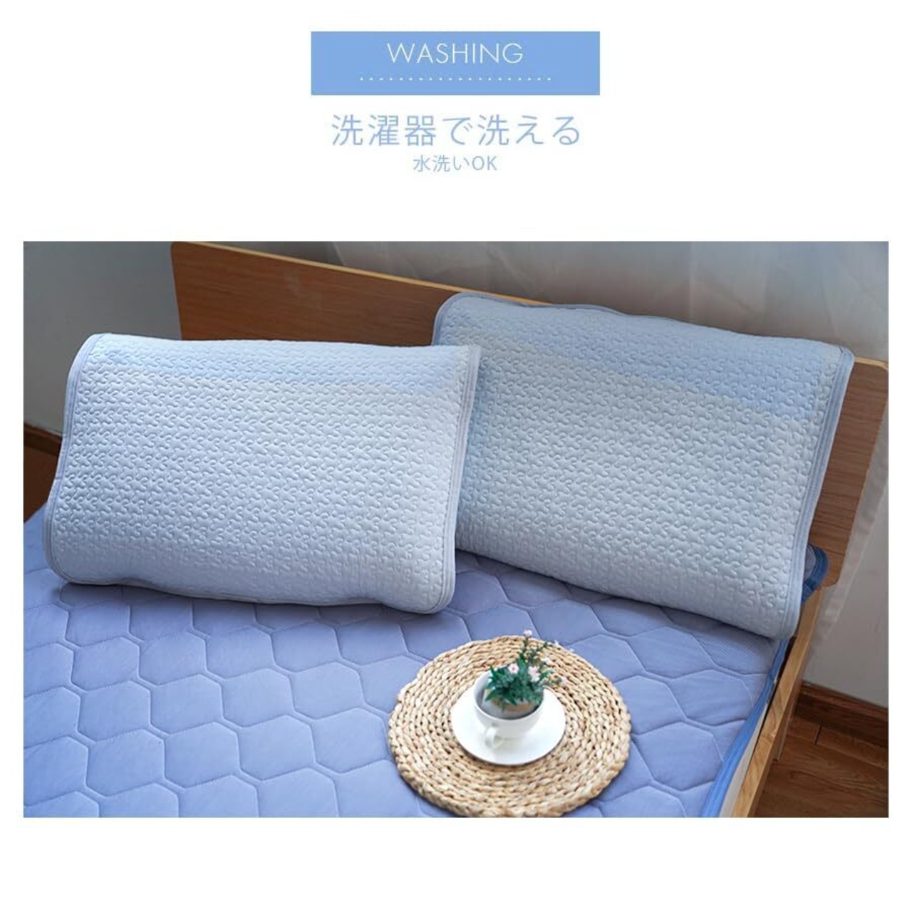 【接触冷感・枕パッド】熱伝導により触れた部分がひんやり感じる接触冷感素材です。冷房と一緒に使用していただくと、よりひんやり感じられます。また、汗をかいても素早く吸収します。やわらか生地の素材は汗や湿気を吸い取ってくれるので、さらっと快適な寝心地に導いてくれます。熱帯夜には,冷感枕カバーと冷感敷パッドを使用すれば、不快な蒸れ感を解消でき、快適な状態をキープします。