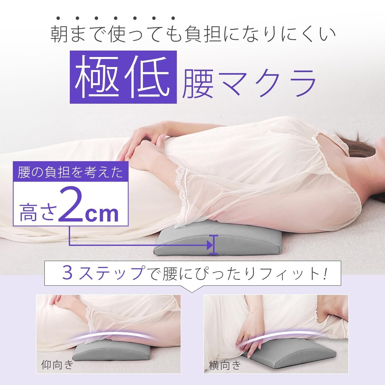 長時間使用しても腰が痛くなりにくい、厚さ2cmの極低腰マクラです。これまでの腰枕が体に合わなかった方も、心地よく眠れるよう設計されています。