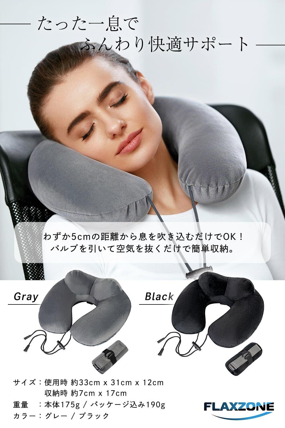 【数量限定】2025年モデル ネックピロー 飛行機用 空気で簡単膨らむ 首枕 超軽量&コンパクト収納 洗えるカバー 飛行機・新 幹線・オフィス・車用 携帯枕|男女兼用 旅行グッズ FLAXZONE 首枕, グレー