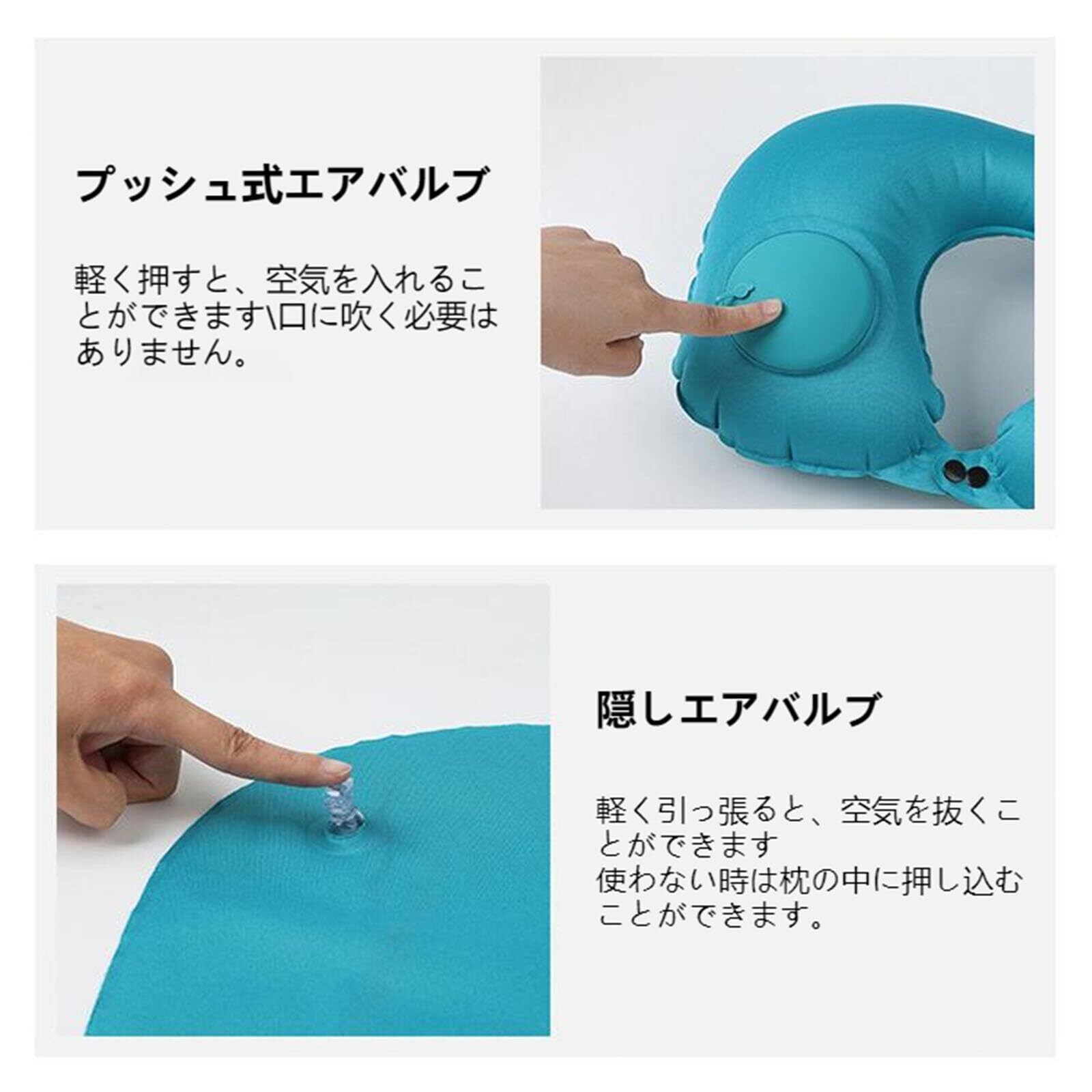 【使用方法】1.枕を平らに寝かせます。 2.背中の排出バルブに蓋をします。 3.漏れ防止装置をオンにします。 4.膨張バルブを両手で繰り返し押します。 5.漏れ防止装置を閉じます。 使用後:6.使用後、一方向弁を絞って空気を抜きます。 7.空気を抜いた後、カバーを外し、付属の収納袋に入れます。