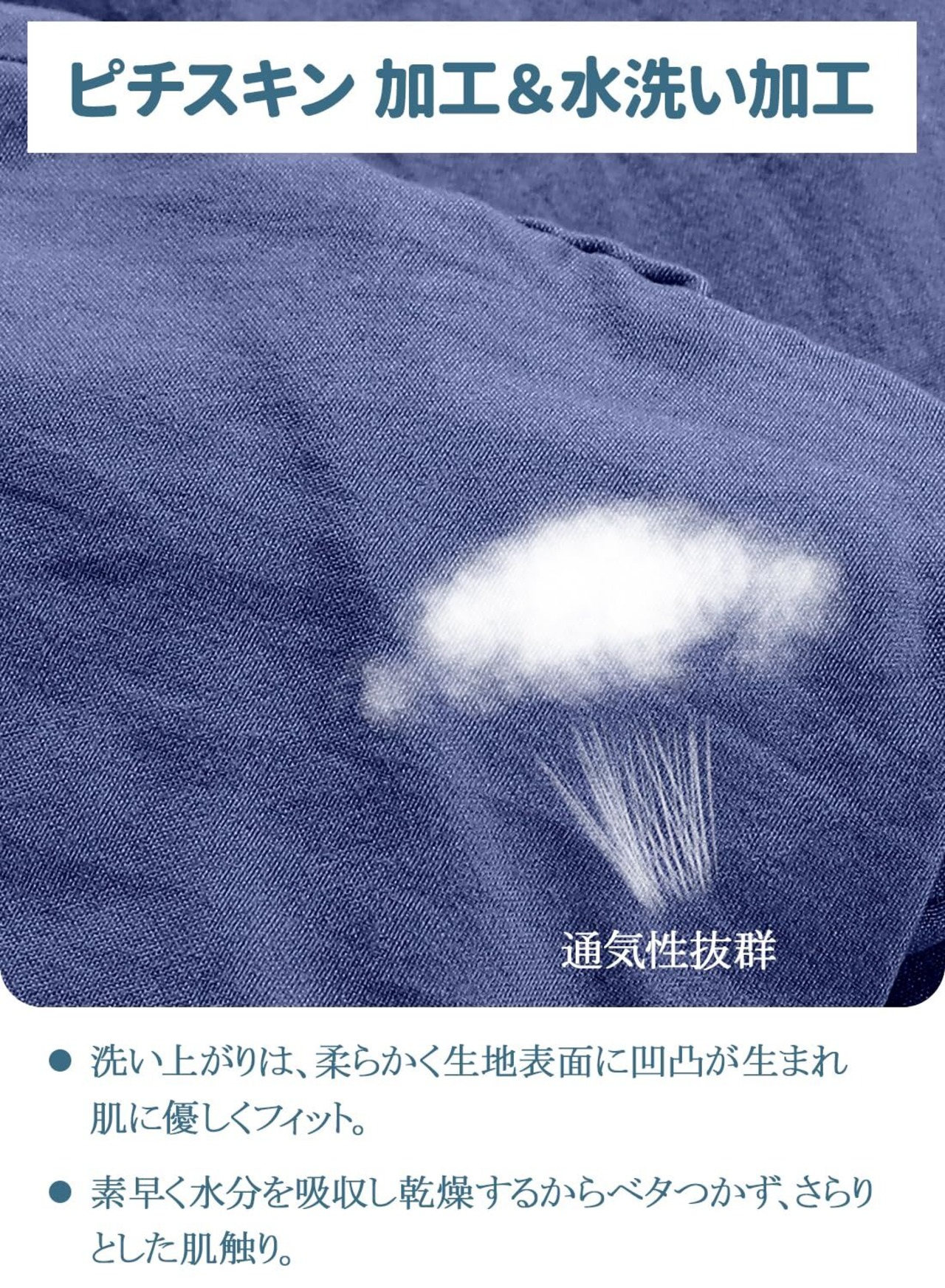 (洗いざらし&速乾性)の掛け布団カバーには、肌触りの良さにこだわったピーチスキン加工を施しています。きめ細かな起毛により、まるで桃のようにやわらかく、なめらかな風合いをお楽しみいただけます。さらに、水洗い加工を加えることで、より自然なやわらかさに仕上げました。一般的なピーチスキン素材よりも柔らかく、毛玉やほつれができにくいのが特長です。また、静電気も起きにくいため、使い始めたその日から、まるで長年愛用してきたかのような心地よさを感じていただけます。