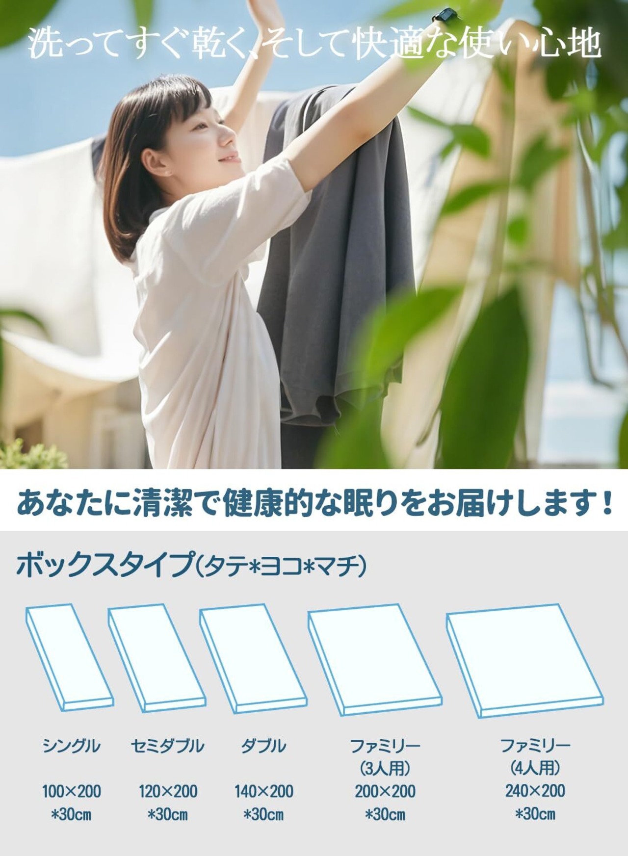 セット内容:ボックスシーツ一枚、(サイズ)ファミリーサイズ3人用・200×200cm 素材:100% ポリエステル/ 360度全周ゴム仕様の箱型デザインで、マットレスをしっかりと包み込みます。着脱も簡単で、厚さ5 cm~28 cmのマットレスに対応可能。※サイズに関するご注意:製品の特性上、表示サイズと実際のサイズに多少の誤差が生じる場合がございます。あらかじめご了承ください。ご使用のベッドやマットレスのサイズを十分にご確認のうえ、お買い求めください。