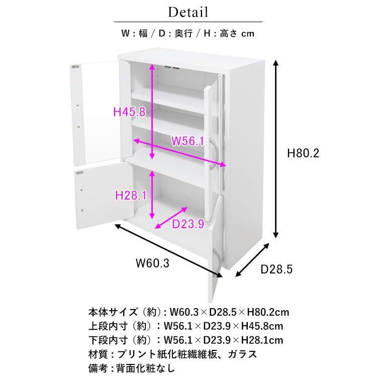 【サイズ】外寸:幅60.3×奥行28.5×高さ80.2(cm)、上段内寸:幅56.1×奥行23.9×高さ45.8(cm)、下段内寸:幅56.1×奥行23.9×高さ28.1(cm)【可動棚調節】上段:10段調節(3.2cmピッチ)【重量】約14kg【耐荷重】天板:5kg、棚板1枚につき:5kg