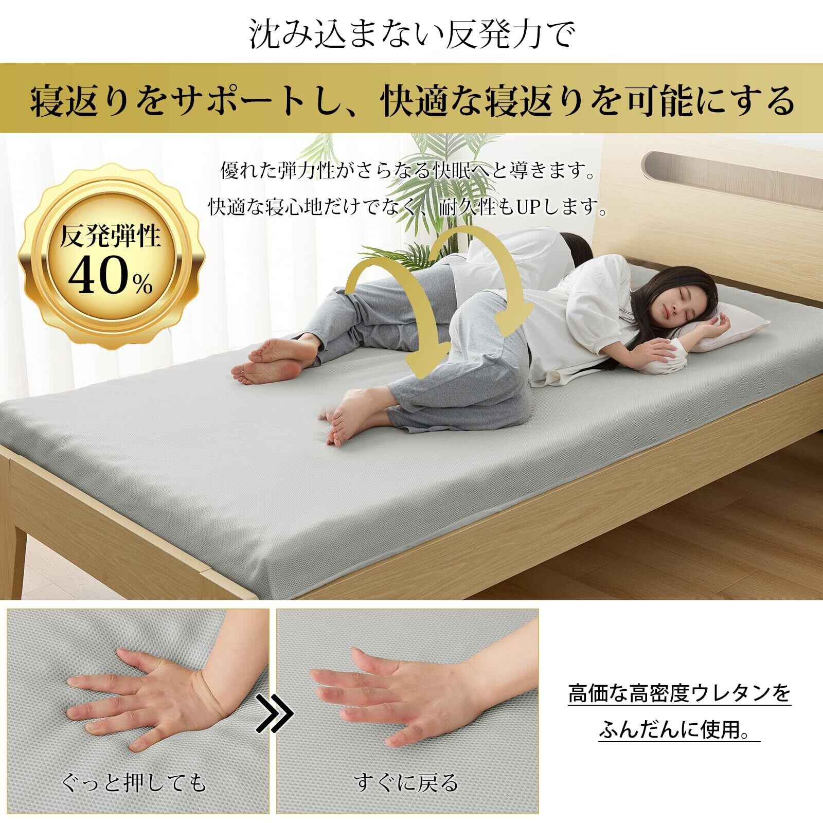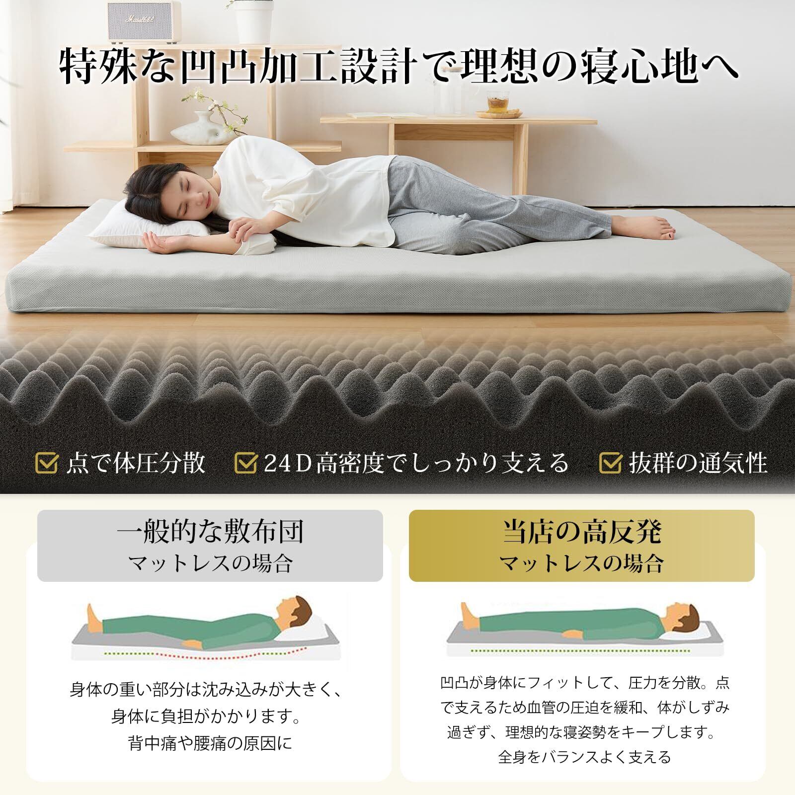 【高反発素材マットレス】弊社のマットレスは高反発素材を採用しており、優れた復元性とクッション性を兼ね備えています。復元率98%超高反発力で快適な眠りをサポートできます。密度24Dで、ぐっと押しても、すぐに戻る高反発マットレスです。10cm極厚でしっかりとした厚みとクッション性があるので、床に直接敷いても底つき感なく快適に使えます。やや硬め190Nの程よい硬さで、しっかり体を支えています。