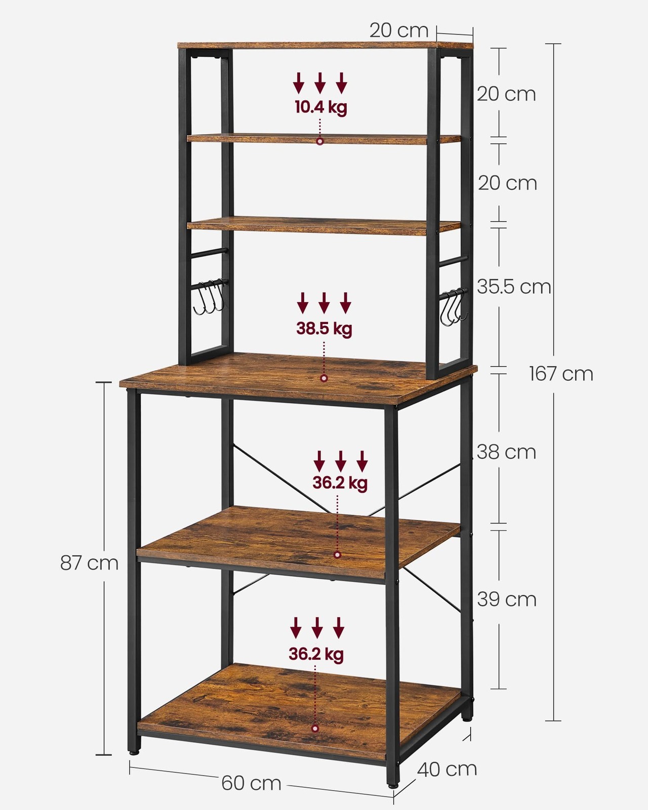 【特価商品】VASAGLE レンジ台 幅60 キッチンラックレンジボード大型レンジ対応 高耐荷設計 可動棚 高さ167cm シンプル 北欧 木目調 電子レンジ ボード 収納 食器棚 6個S字ラックを付きKKS024B01