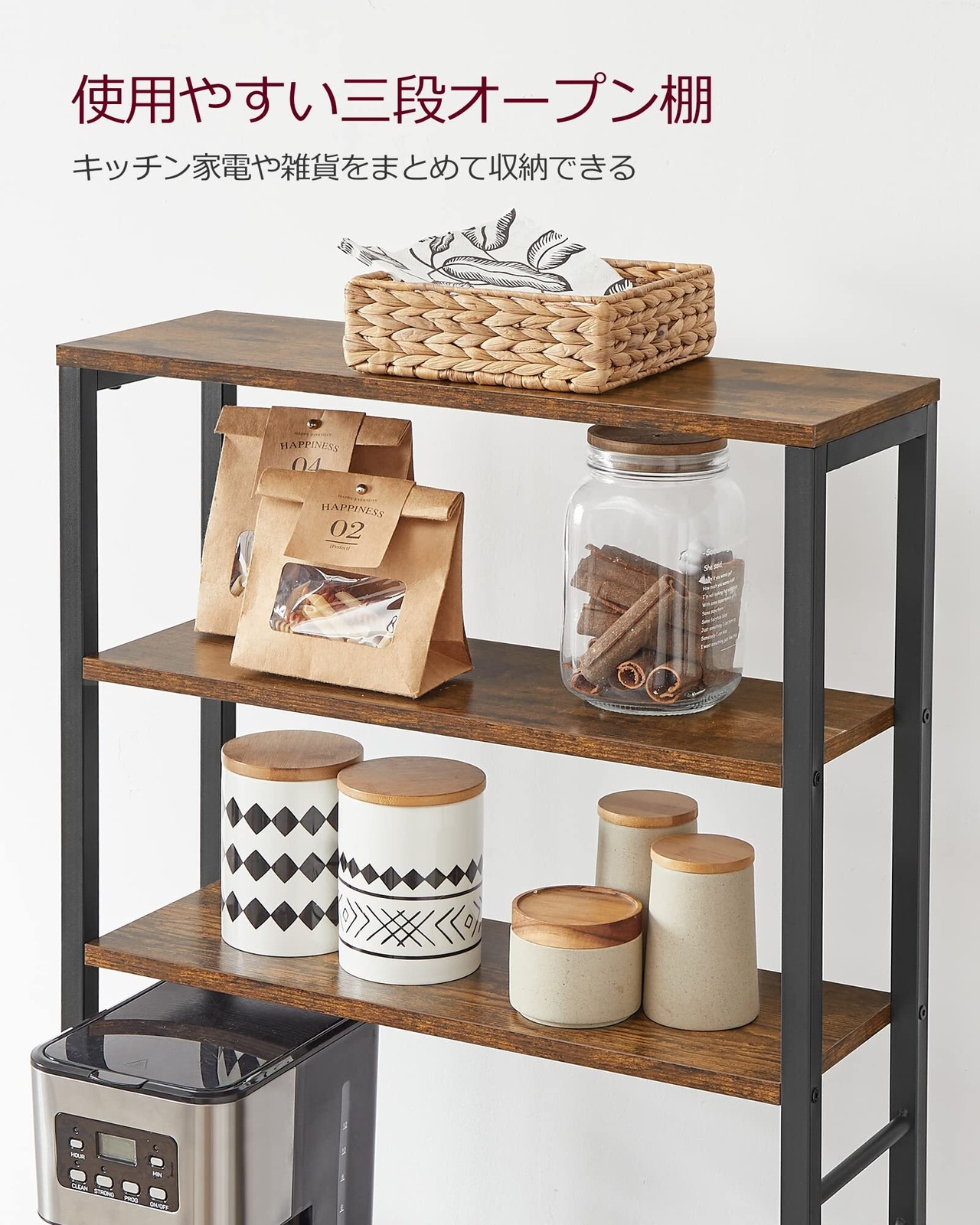 【シックなデザイン】ブラックのフレームと木目の組み合わせが落ち着いたアメリカンヴィンテージな雰囲気を演出してくれます。毎日使うキッチン用品を使いやすく、すっきりと収納