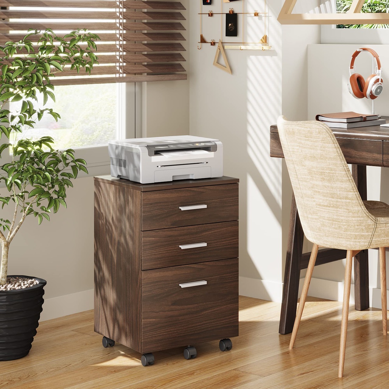 デスクワゴン サイドワゴン キャビネット オフィスワゴン 袖机 木製 3段 A4対応 大容量 キャスター付き 幅400*奥行400*高さ595mm ダークブラウン 木目