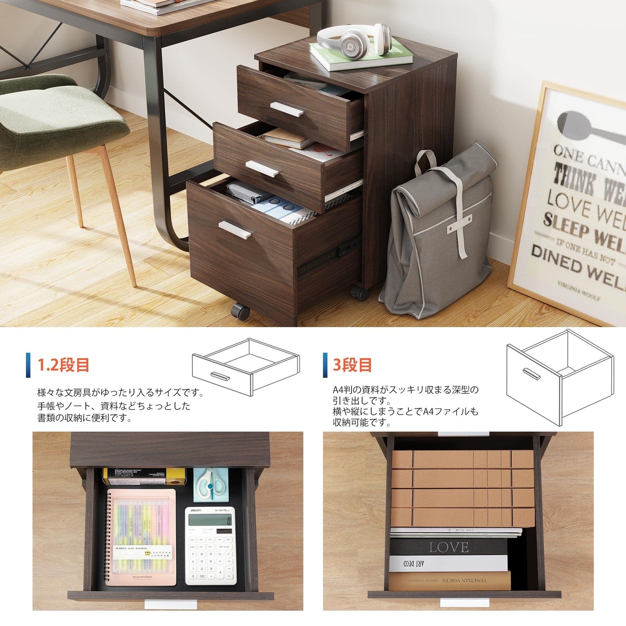 【3段収納】引き出しが3段付き、用途で使い分けられるので細かいファイル整理が可能。1段目、2段目はA4ファイルが横向きでゆったり入るサイズで、浅めの設計なので文具などの小物も取り出し簡単です。3段目は、A4ファイルが縦でも横でもすっぼり納まります。効率よく整理できる同時に、充分な作業スペースもします。