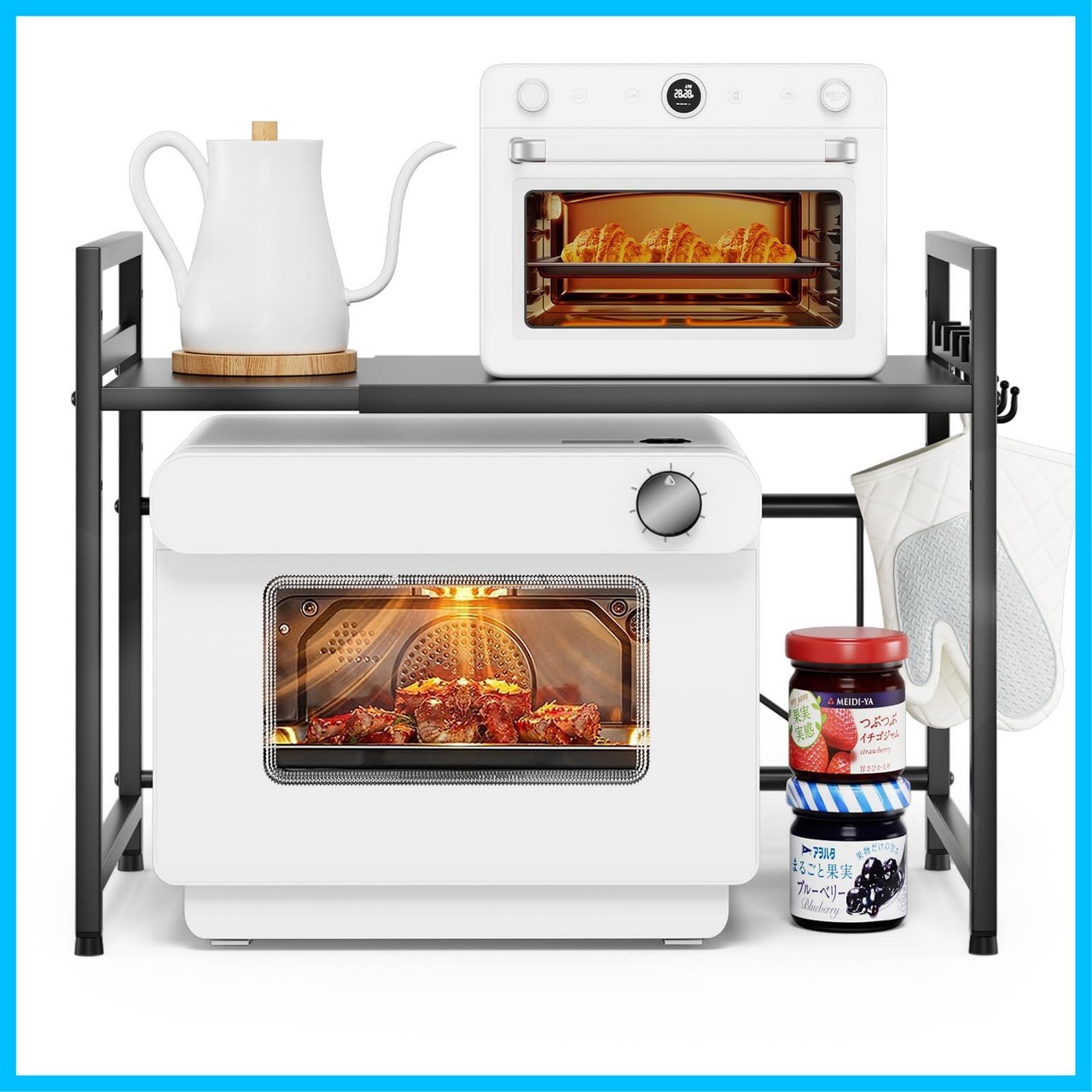【特価セール】レンジ上ラック トースターラック レンジラック 伸縮式 幅(36~65cm) 棚板高さ調節可 耐荷重50kg シンク上キッチン収納ラック フック4個付き (ブラック)