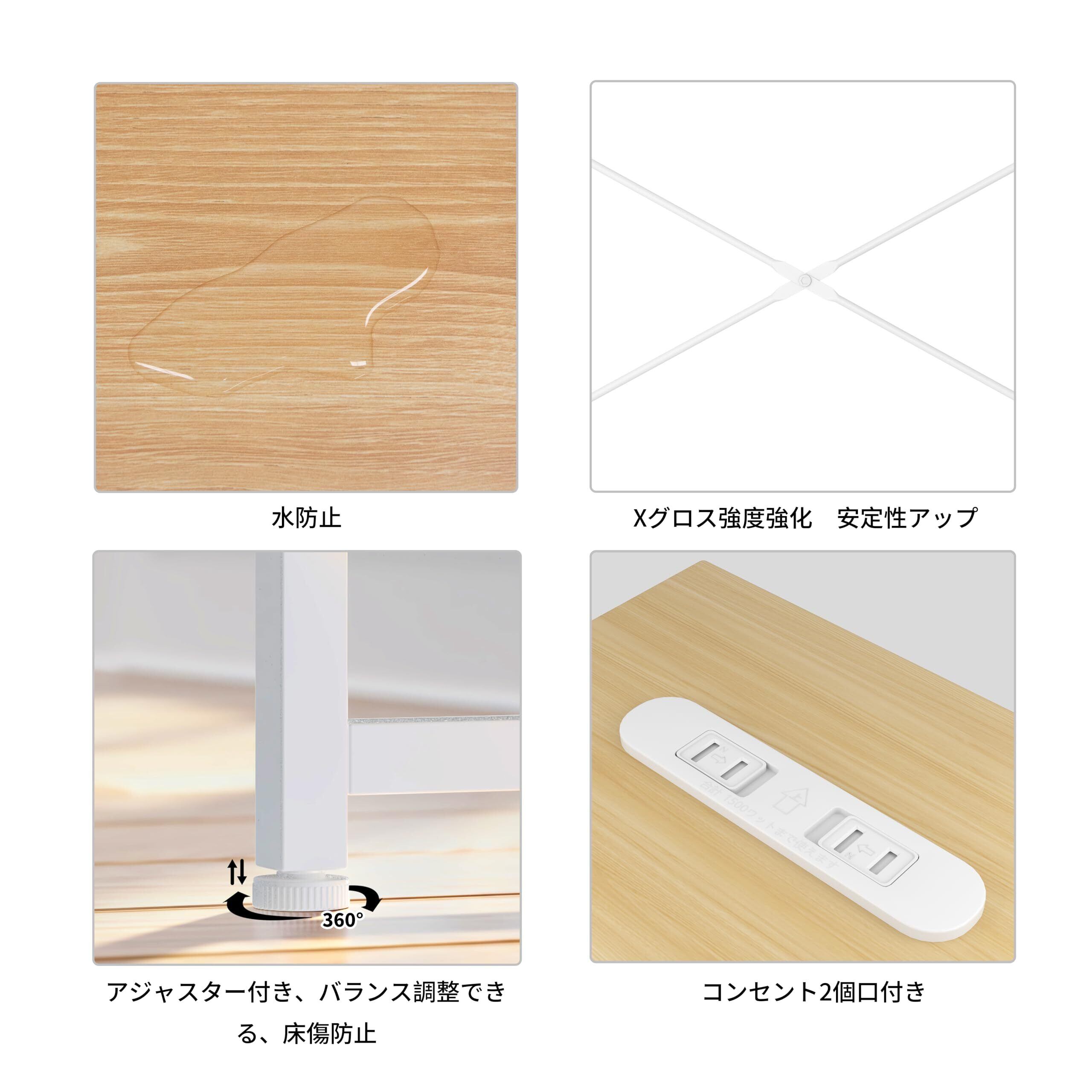 【安全構造】:日本デザインに基づいた頑丈な構造、天板と棚板はネジ止めにより確実に固定されており、長期間にわたって緩みを防止しています。スチールフレームは他社製品と違って、2箇所にX型補強材が配置し、強度アップのサポートがあります。耐震転倒防止パーツも付いてます。