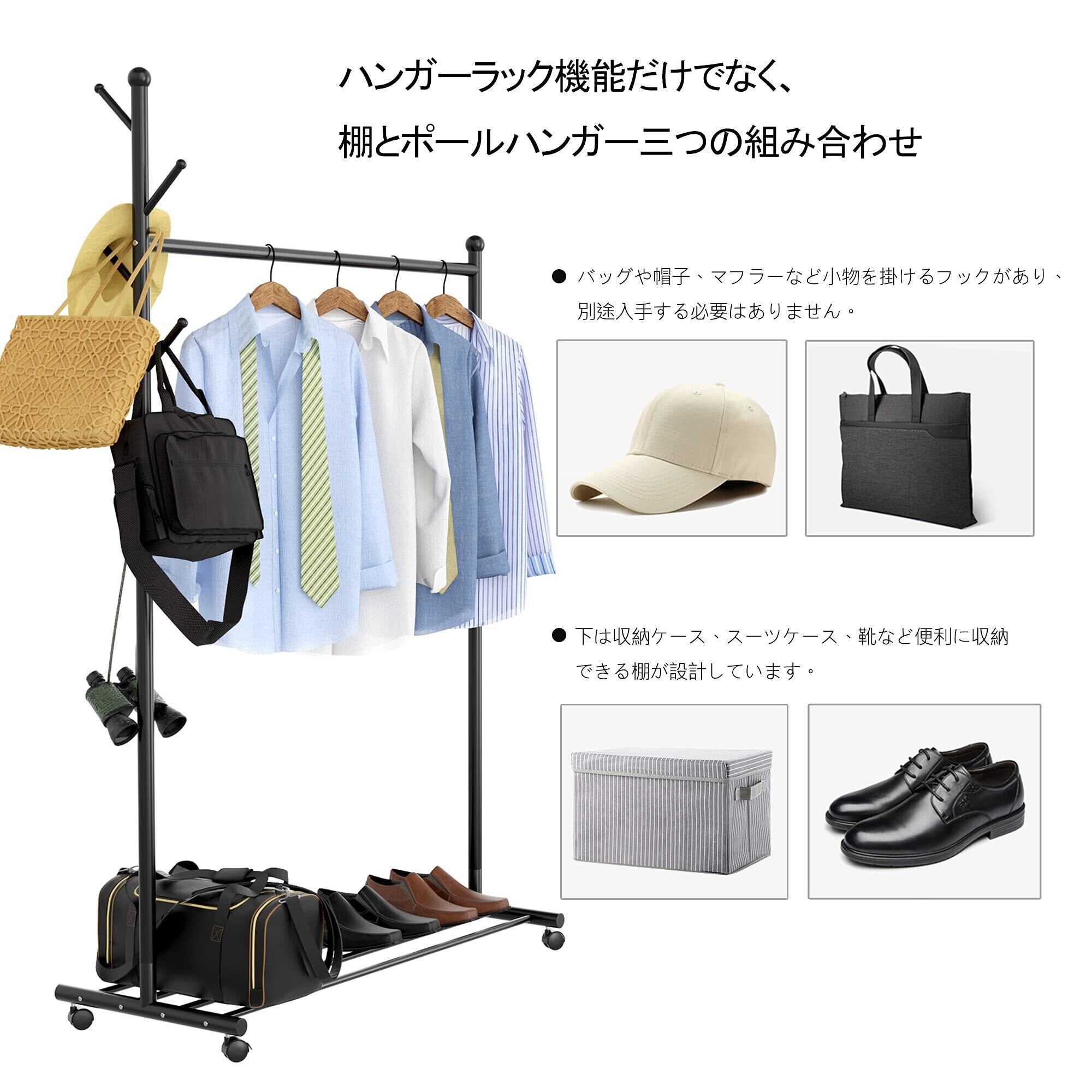 【新着商品】ハンガーラック ポールハンガー コートラック パイプハンガー 物干しスタンド 衣類ラック 衣類収納 幅105×奥行43×高さ170cm コートハンガー スタイルハンガー 洋服掛け 洗濯 ラック ポールラック スチールハンガー おしゃれ シングルハンガー ふくかけスタンド 大容量 収納ラック 落ちにくいフック 組立品 太パイプ シングル プロ 頑丈 耐荷重75kg 梅雨対策 キャスター 棚付き (ブラック)