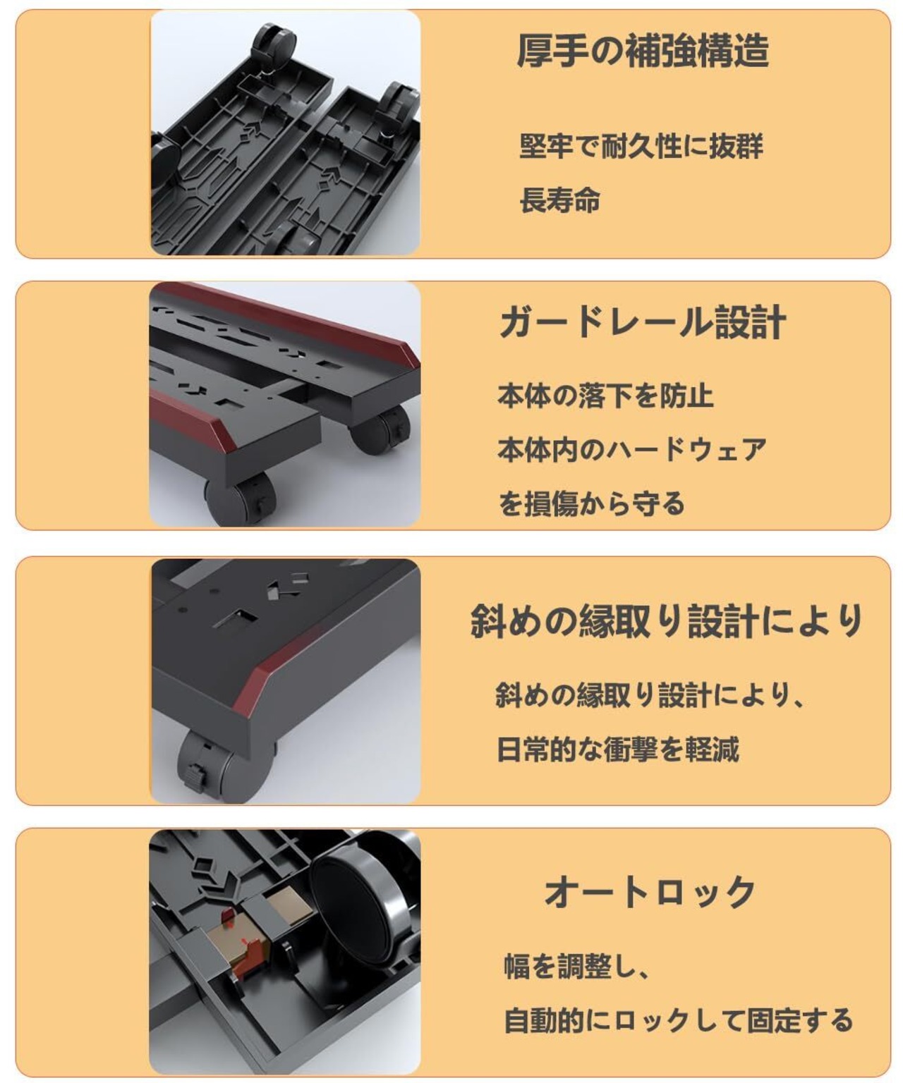【CPUスタンドサイズ】約W45 × D23~30× H10cm 本体重量:1.1g 耐荷重約:40kg ウォーターサーバーのガロンボトルなど、 PC以外の重い物の移動時にもご使用いただけます。工具不要の簡単組み立て。