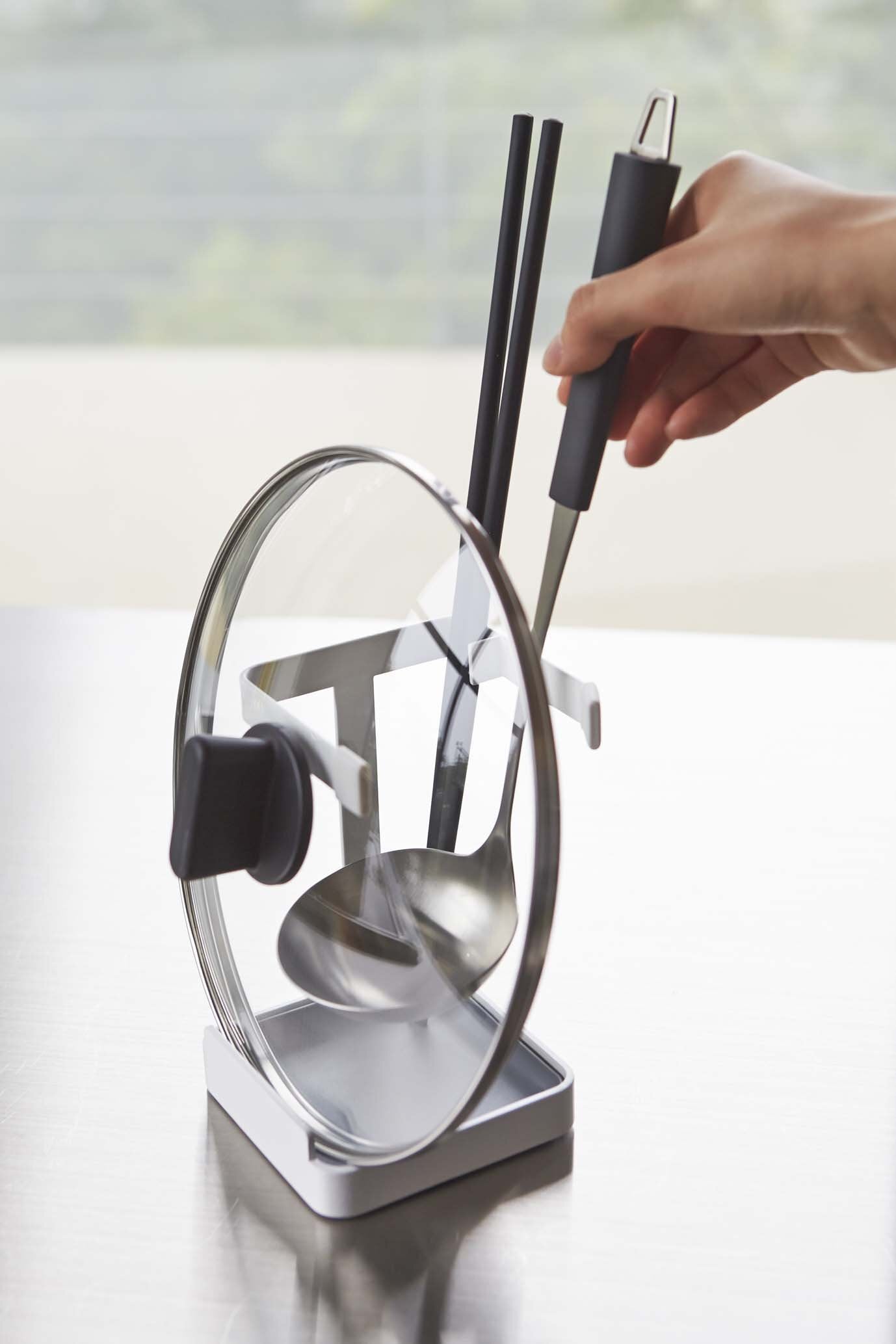 調理中のお玉・鍋ふた・菜箸スタンド。ふたを立てたままでも、お玉の出し入れがスムーズ! トレイが外せるのでお手入れ簡単! 食卓でお鍋の時にも重宝します。まな板・タブレットスタンドとして。