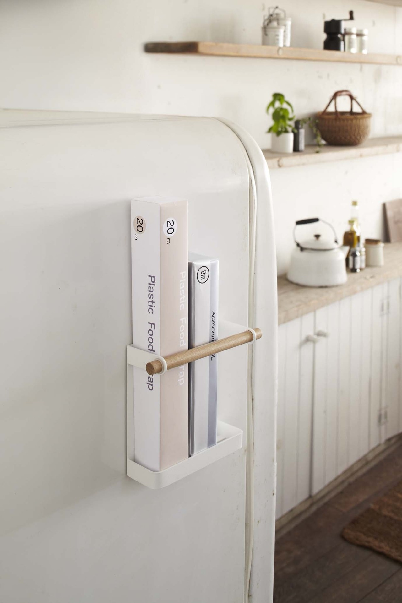 スチールと木の組み合わせが美しいマグネットラップホルダー。マグネット式で壁面にラップ類をスッキリと収納できます。